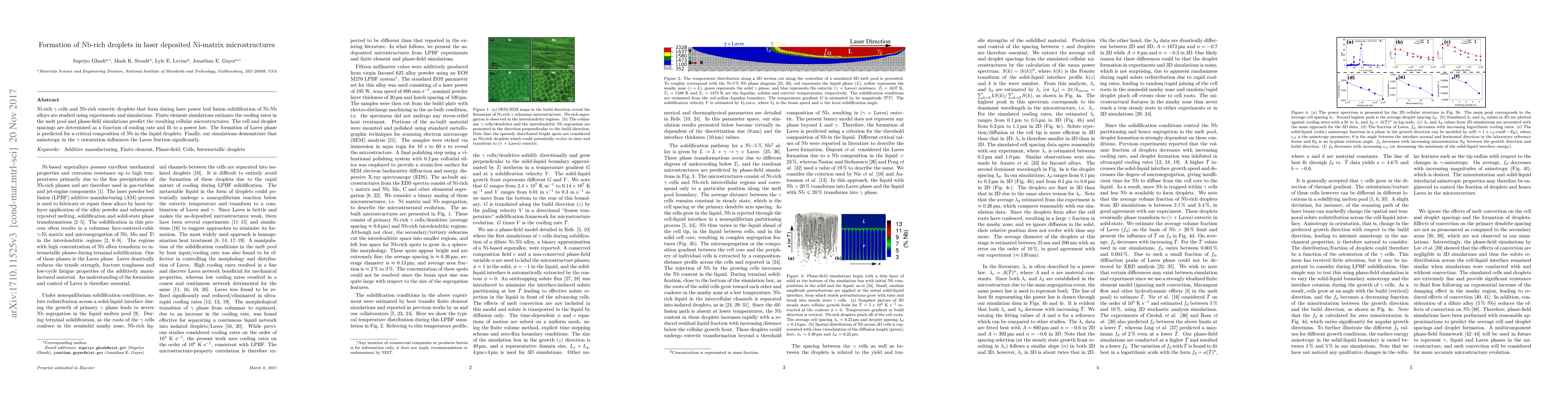 Ni-rich $\gamma$ cells and Nb-rich eutectic droplets that form during laser power bed fusion solidification of Ni-Nb alloys are studied using experiments and simulations. Finite element simulations estimate the cooling rates in the melt pool and phase-field simulations predict the resulting cellular microstructures. The cell and droplet spacings are determined as a function of cooling rate and fit to a power law. The formation of Laves phase is predicted for a critical composition of Nb in the liquid droplets. Finally, our simulations demonstrate that anisotropy in the $\gamma$ orientation influences the Laves fraction significantly.