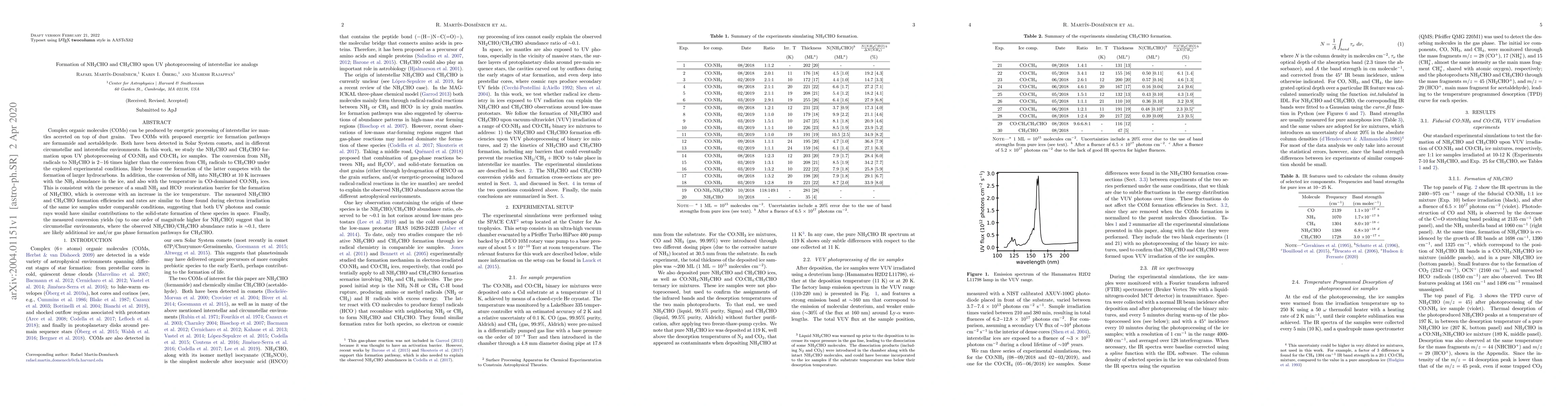 This study investigates the formation of formamide (NH2CHO) and acetaldehyde (CH3CHO) through UV photoprocessing of interstellar ice analogs containing CO, NH3, and CH4. The results show that NH2CHO formation is significantly more efficient than CH3CHO, likely due to competition with larger hydrocarbon formation pathways.