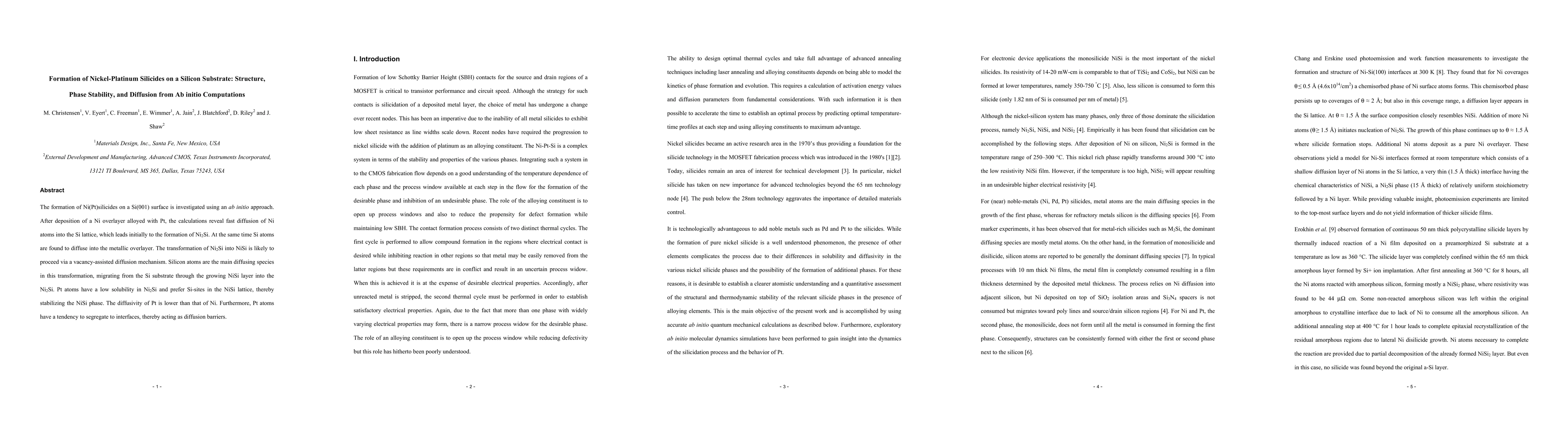 This paper uses ab initio computations to study the formation and phase stability of nickel-platinum silicides on silicon substrates. It finds rapid diffusion of nickel into silicon leading to Ni2Si formation, with silicon atoms migrating through the NiSi layer to stabilize it, while platinum atoms have low solubility and act as diffusion barriers at interfaces.