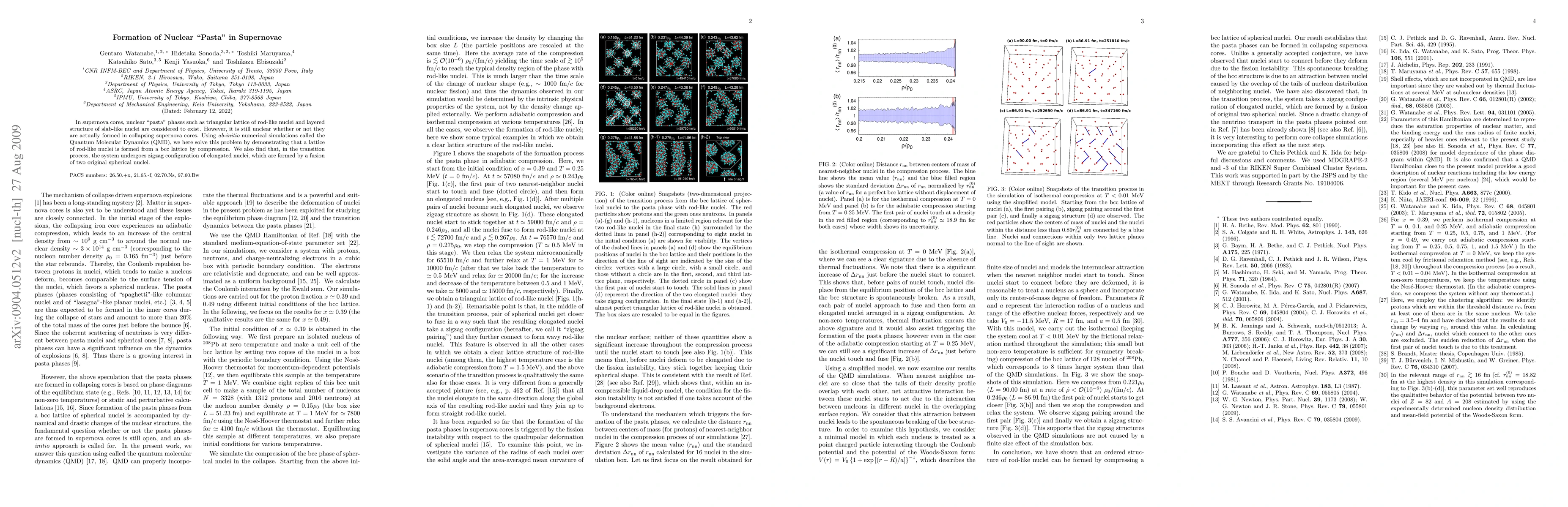 In supernova cores, nuclear "pasta" phases such as triangular lattice of rod-like nuclei and layered structure of slab-like nuclei are considered to exist. However, it is still unclear whether or not they are actually formed in collapsing supernova cores. Using {\it ab-initio} numerical simulations called the Quantum Molecular Dynamics (QMD), we here solve this problem by demonstrating that a lattice of rod-like nuclei is formed from a bcc lattice by compression. We also find that, in the transition process, the system undergoes zigzag configuration of elongated nuclei, which are formed by a fusion of two original spherical nuclei.