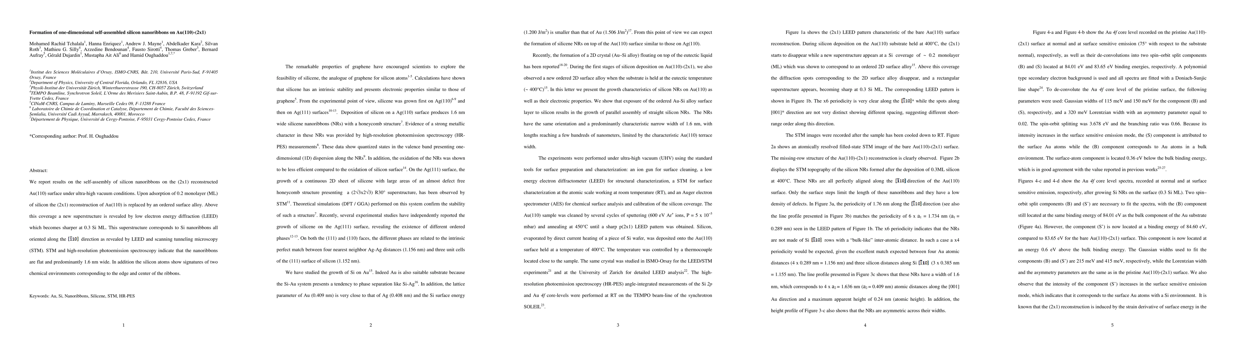 This study reveals the formation of one-dimensional silicon nanoribbons on Au(110)-(2x1) surfaces through self-assembly, with the ribbons predominantly oriented along the [-110] direction and showing distinct chemical environments for edge and center silicon atoms. The transition to this superstructure occurs above a silicon coverage of 0.2 monolayers.