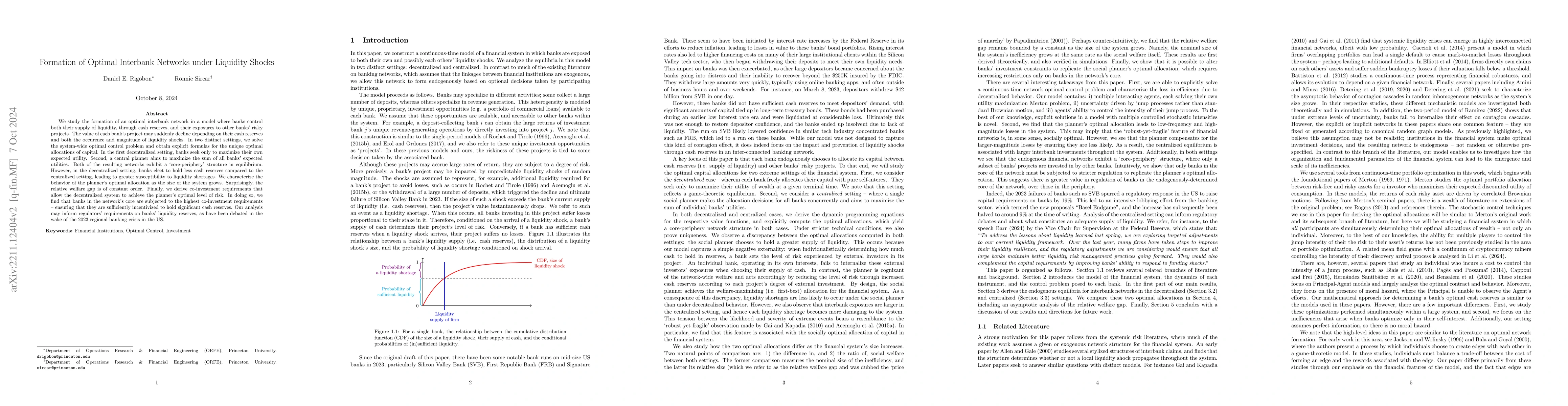 We formulate a model of the banking system in which banks control both their supply of liquidity, through cash holdings, and their exposures to risky interbank loans. The value of interbank loans jumps when banks suffer liquidity shortages, which can be caused by the arrival of large enough liquidity shocks. In two distinct settings, we compute the unique optimal allocations of capital. In the first, banks seek only to maximize their own utility -- in a decentralized manner. Second, a central planner aims to maximize the sum of all banks' utilities. Both of the resulting financial networks exhibit a `core-periphery' structure. However, the optimal allocations differ -- decentralized banks are more susceptible to liquidity shortages, while the planner ensures that banks with more debt hold greater liquidity. We characterize the behavior of the planner's optimal allocation as the size of the system grows. Surprisingly, the `price of anarchy' is of constant order. Finally, we derive capitalization requirements that cause the decentralized system to achieve the planner's level of risk. In doing so, we find that systemically important banks must face the greatest losses when they suffer liquidity crises -- ensuring that they are incentivized to avoid such crises.