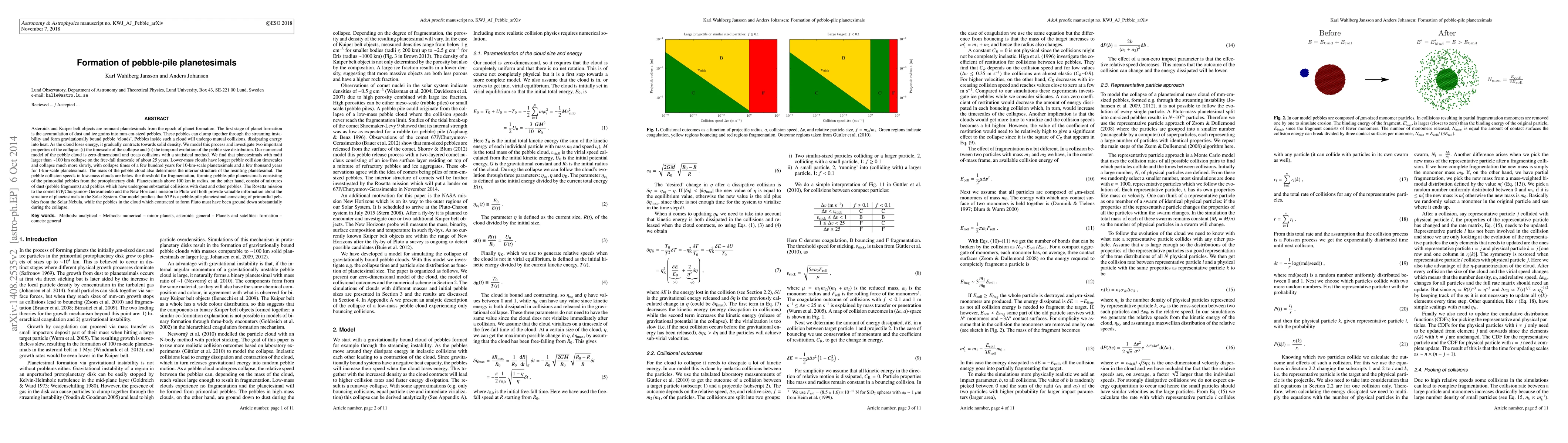 The first stage of planet formation is the accumulation of dust and ice grains into mm-cm-sized pebbles. These pebbles can clump together through the streaming instability and form gravitationally bound pebble 'clouds'. Pebbles inside such a cloud will undergo mutual collisions, dissipating energy into heat. As the cloud loses energy, it gradually contracts towards solid density. We model this process and investigate two important properties of the collapse: (i) the timescale of the collapse and (ii) the temporal evolution of the pebble size distribution. Our numerical model of the pebble cloud is zero-dimensional and treats collisions with a statistical method. We find that planetesimals with radii larger than 100 km collapse on the free-fall timescale of about 25 years. Lower-mass clouds have longer pebble collision timescales and collapse much more slowly, with collapse times of a few hundred years for 10-km-scale planetesimals and a few thousand years for 1-km-scale planetesimals. The mass of the pebble cloud also determines the interior structure of the resulting planetesimal. The pebble collision speeds in low-mass clouds are below the threshold for fragmentation, forming pebble-pile planetesimals consisting of the primordial pebbles from the protoplanetary disk. Planetesimals above 100 km in radius, on the other hand, consist of mixtures of dust (pebble fragments) and pebbles which have undergone substantial collisions with dust and other pebbles. The Rosetta mission to the comet 67P/Churyumov-Gerasimenko and the New Horizons mission to Pluto will both provide valuable information about the structure of planetesimals in the Solar System. Our model predicts that 67P is a pebble-pile planetesimal consisting of primordial pebbles from the Solar Nebula, while the pebbles in the cloud which contracted to form Pluto must have been ground down substantially during the collapse.