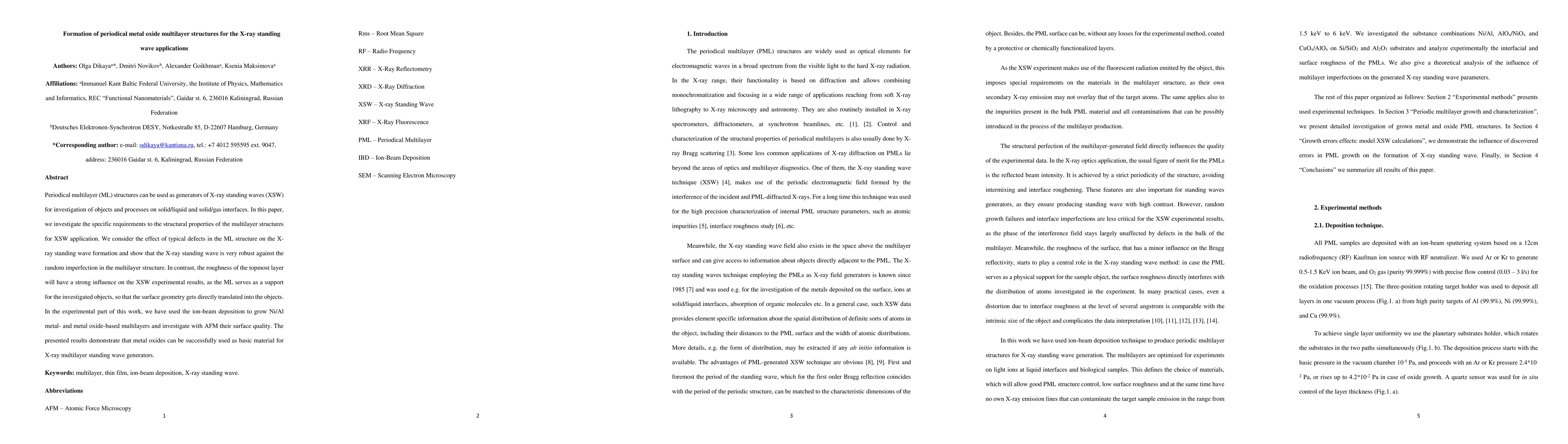 This paper explores the formation of periodical metal oxide multilayer structures for generating X-ray standing waves (XSW) to study interfaces. It finds that while typical defects have minimal impact, the topmost layer's roughness significantly affects XSW results, and demonstrates successful growth of Ni/Al metal oxide multilayers using ion-beam deposition.
