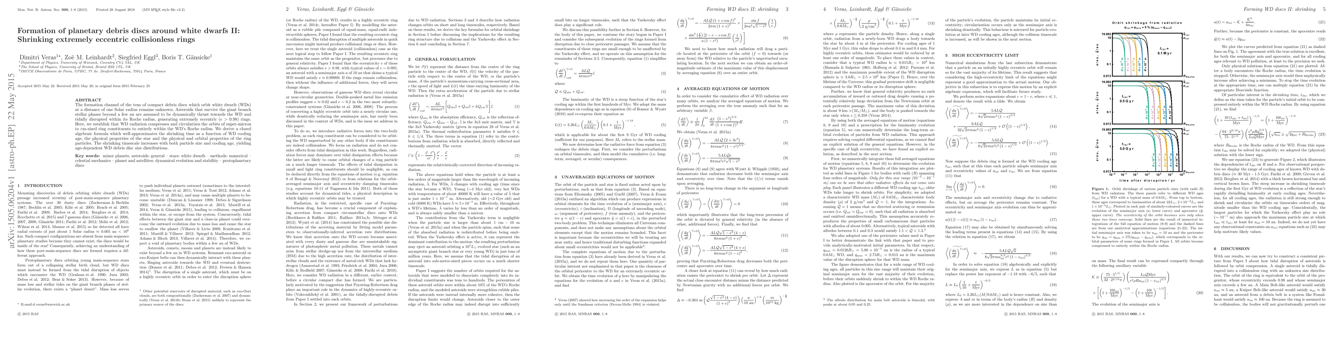 This paper investigates the formation and evolution of compact debris discs around white dwarfs, proposing that asteroid remnants from the giant branch phases are compressed and circularized by the white dwarf's radiation, leading to shrinking, extremely eccentric rings. A formula is derived to approximate the shrinking timescale based on the white dwarf's cooling age and properties of the ring particles.