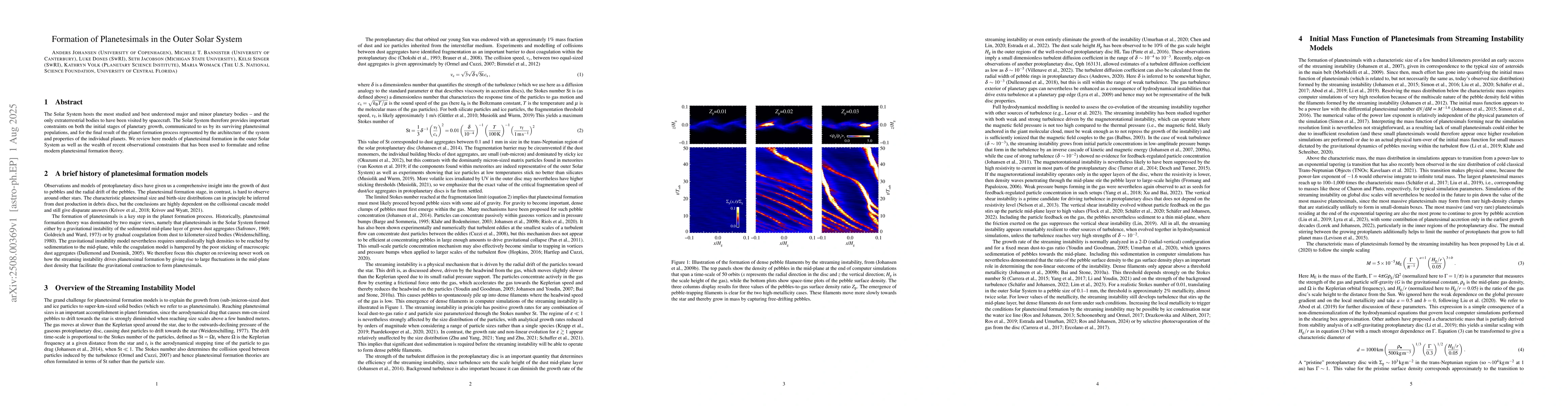 The Solar System hosts the most studied and best understood major and minor planetary bodies - and the only extraterrestrial bodies to have been visited by spacecraft. The Solar System therefore provides important constraints on both the initial stages of planetary growth, communicated to us by its surviving planetesimal populations, and for the final result of the planet formation process represented by the architecture of the system and properties of the individual planets. We review here models of planetesimal formation in the outer Solar System as well as the wealth of recent observational constraints that has been used to formulate and refine modern planetesimal formation theory.