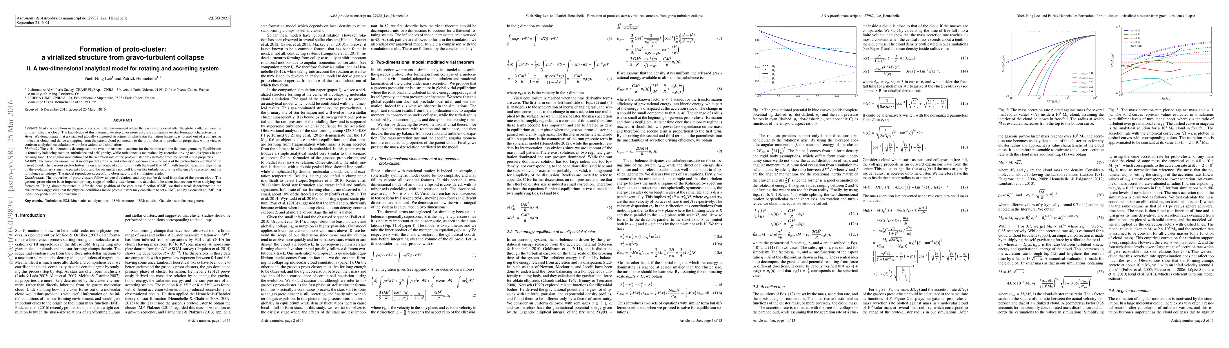 This paper presents a two-dimensional analytical model for the formation of proto-clusters from gravo-turbulent collapse, focusing on rotating and accreting systems. The model predicts proto-cluster properties based on parent cloud parameters, showing a universal relation $R \sim M^{0.5}$ and successfully matching observations and simulations.