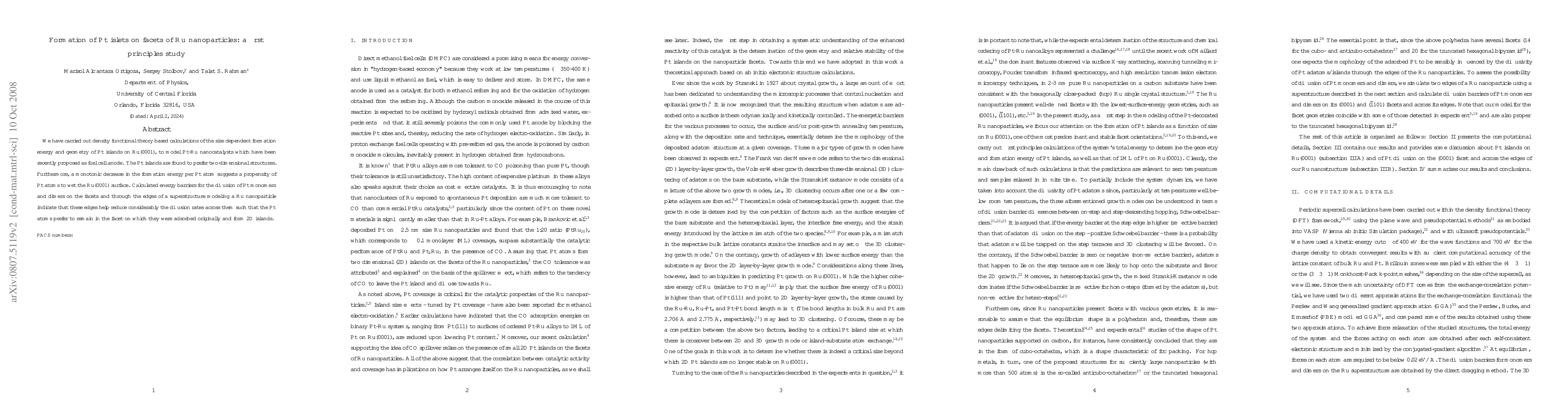 We have carried out density functional theory based calculations of the size dependent formation energy and geometry of Pt islands on Ru(0001), to model Pt-Ru nanocatalysts which have been recently proposed as fuel cell anode. The Pt islands are found to prefer two-dimensional structures. Furthermore, a monotonic decrease in the formation energy per Pt atom suggests a propensity of Pt atoms to wet the Ru(0001) surface. Calculated energy barriers for the diffusion of Pt monomers and dimers on the facets and through the edges of a superstructure modeling a Ru nanoparticle indicate that these edges help reduce considerably the diffusion rates across them such that the Pt atoms prefer to remain in the facet on which they were adsorbed originally and form 2D islands.