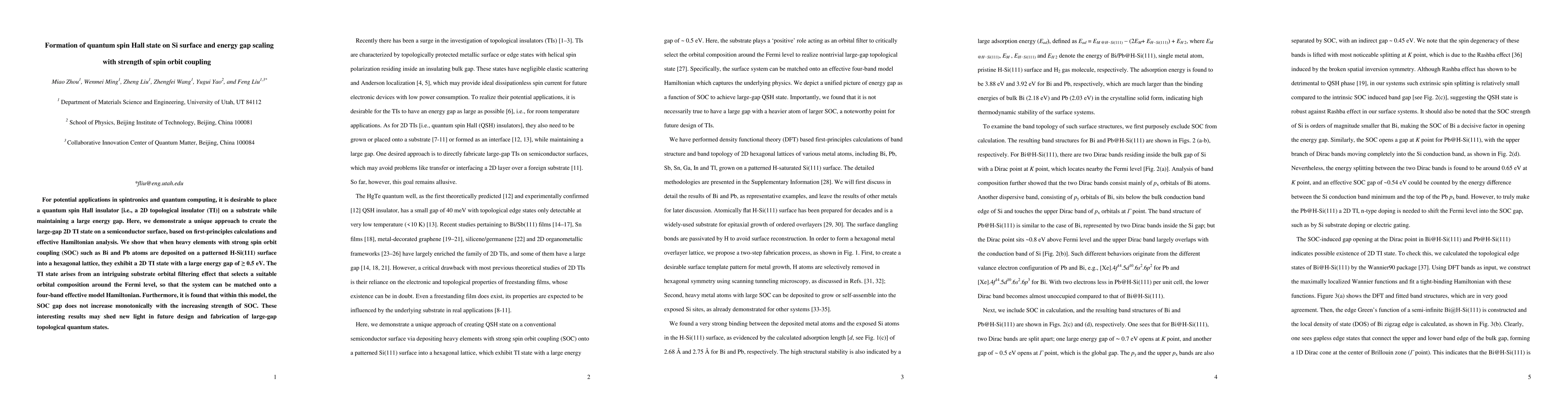 This paper demonstrates the formation of a large-gap quantum spin Hall insulator on a Si surface using heavy elements like Bi and Pb, revealing a non-monotonic scaling of the energy gap with the strength of spin-orbit coupling. This approach could advance the development of topological states for spintronics and quantum computing.