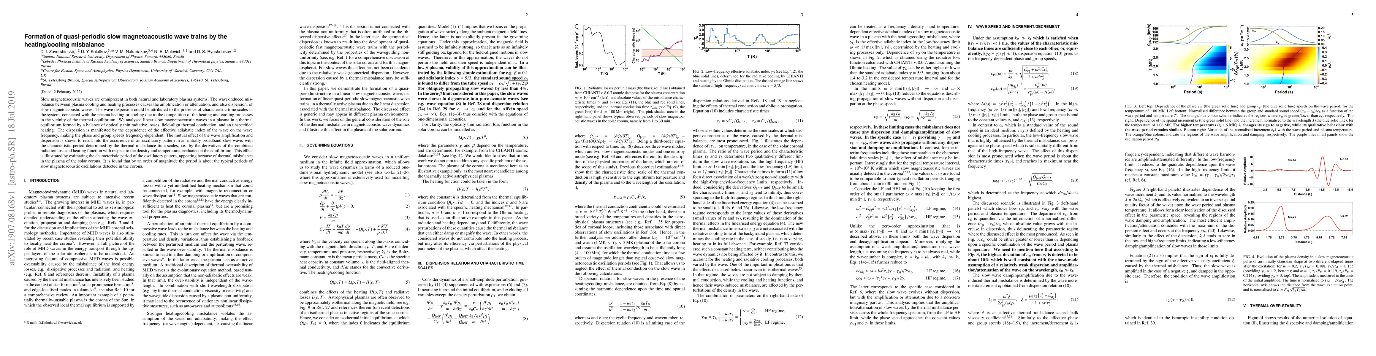 This paper investigates the formation of quasi-periodic slow magnetoacoustic waves in plasmas due to heating/cooling misbalance. The study reveals that wave dispersion, caused by time scales in the plasma heating and cooling processes, leads to an oscillatory pattern in the wave train, with a period determined by thermal misbalance time scales.
