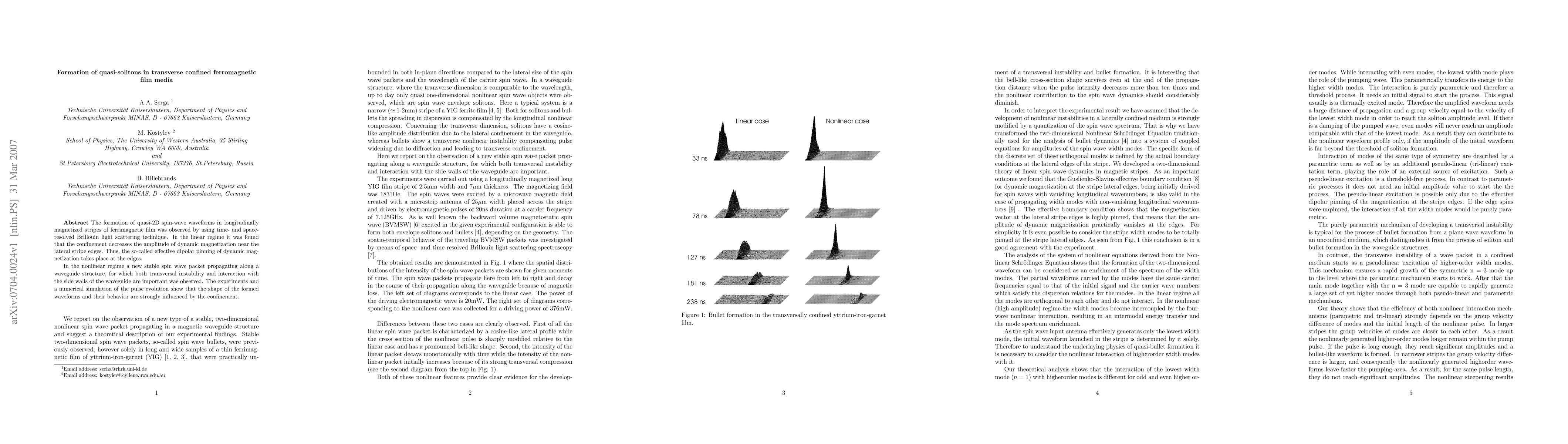 The formation of quasi-2D spin-wave waveforms in longitudinally magnetized stripes of ferrimagnetic film was observed by using time- and space-resolved Brillouin light scattering technique. In the linear regime it was found that the confinement decreases the amplitude of dynamic magnetization near the lateral stripe edges. Thus, the so-called effective dipolar pinning of dynamic magnetization takes place at the edges. In the nonlinear regime a new stable spin wave packet propagating along a waveguide structure, for which both transversal instability and interaction with the side walls of the waveguide are important was observed. The experiments and a numerical simulation of the pulse evolution show that the shape of the formed waveforms and their behavior are strongly influenced by the confinement.