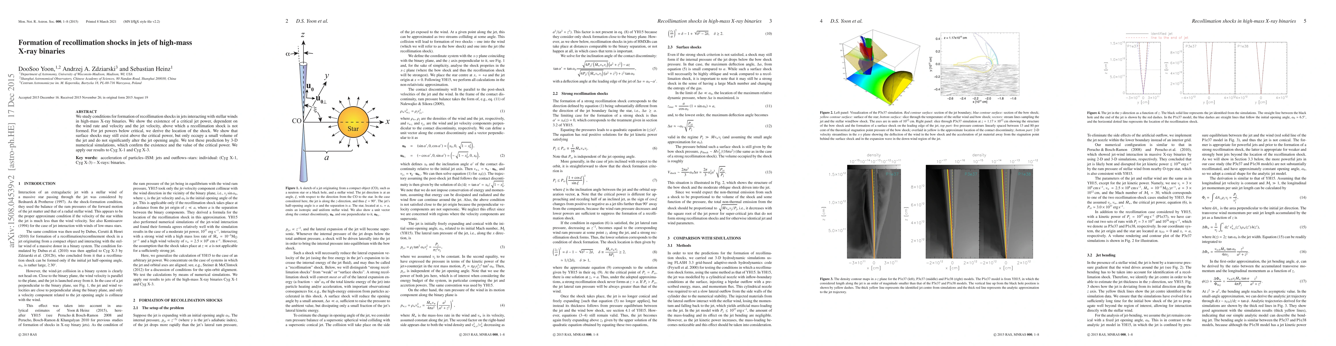 This paper investigates the formation of recollimation shocks in jets from high-mass X-ray binaries, identifying a critical jet power threshold that determines whether such shocks occur. Below this critical power, the location of the shock is derived, while above it, surface shocks exist but minimally affect the jet's opening angle. Numerical simulations confirm these findings and the results are applied to Cyg X-1 and Cyg X-3.