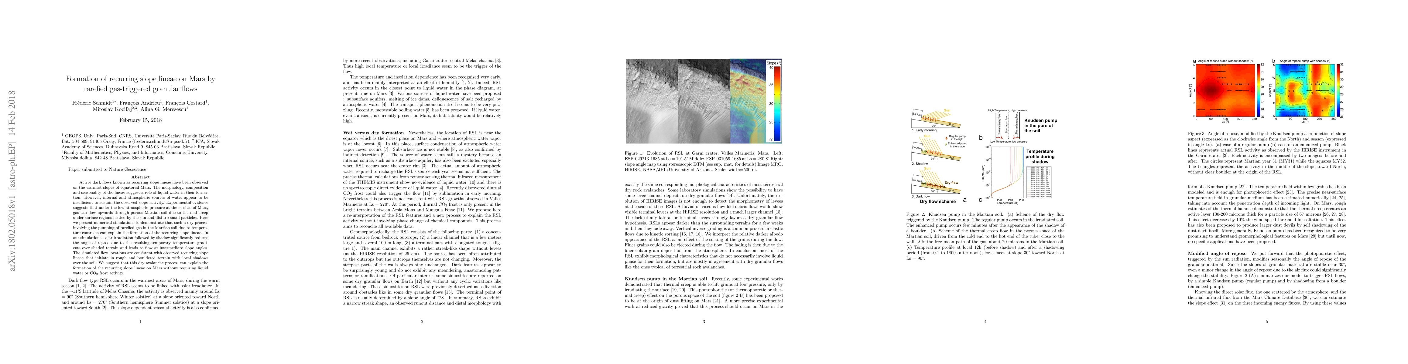 This paper proposes that recurring slope lineae on Mars form through rarefied gas-triggered granular flows driven by temperature contrasts, eliminating the need for liquid water. Numerical simulations show that solar heating and subsequent shadowing reduce the angle of repose, causing dry granular flows in shaded, bouldered terrains.