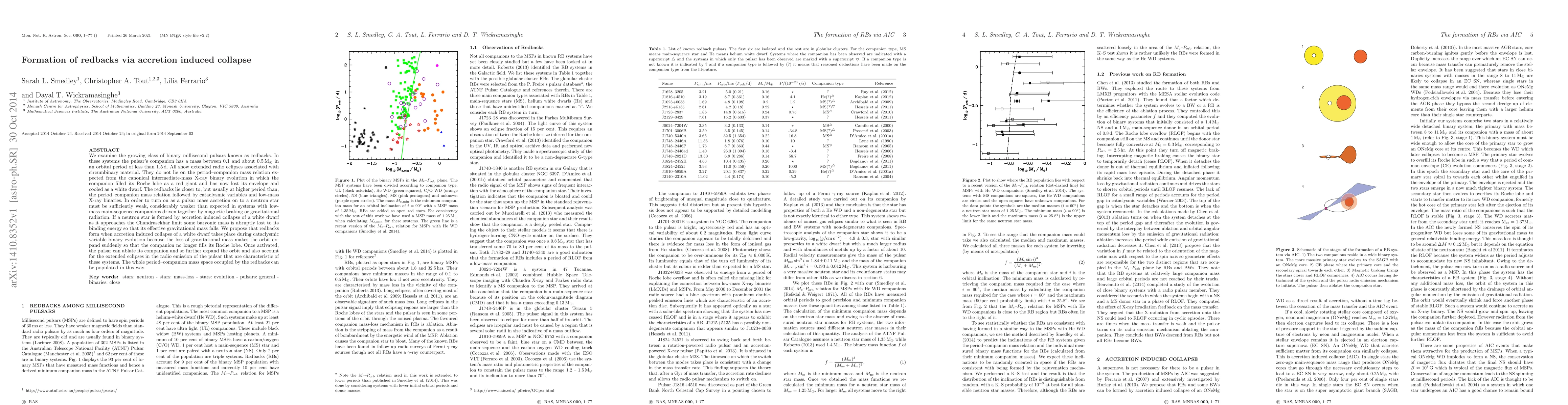 We examine the growing class of binary millisecond pulsars known as redbacks. In these systems the pulsar's companion has a mass between 0.1 and about 0.5 solar masses in an orbital period of less than 1.5 days. All show extended radio eclipses associated with circumbinary material. They do not lie on the period-companion mass relation expected from the canonical intermediate-mass X-ray binary evolution in which the companion filled its Roche lobe as a red giant and has now lost its envelope and cooled as a white dwarf. The redbacks lie closer to, but usually at higher period than, the period-companion mass relation followed by cataclysmic variables and low-mass X-ray binaries. In order to turn on as a pulsar mass accretion on to a neutron star must be sufficiently weak, considerably weaker than expected in systems with low-mass main-sequence companions driven together by magnetic braking or gravitational radiation. If a neutron star is formed by accretion induced collapse of a white dwarf as it approaches the Chandrasekhar limit some baryonic mass is abruptly lost to its binding energy so that its effective gravitational mass falls. We propose that redbacks form when accretion induced collapse of a white dwarf takes place during cataclysmic variable binary evolution because the loss of gravitational mass makes the orbit expand suddenly so that the companion no longer fills its Roche lobe. Once activated, the pulsar can ablate its companion and so further expand the orbit and also account for the extended eclipses in the radio emission of the pulsar that are characteristic of these systems. The whole period-companion mass space occupied by the redbacks can be populated in this way.
