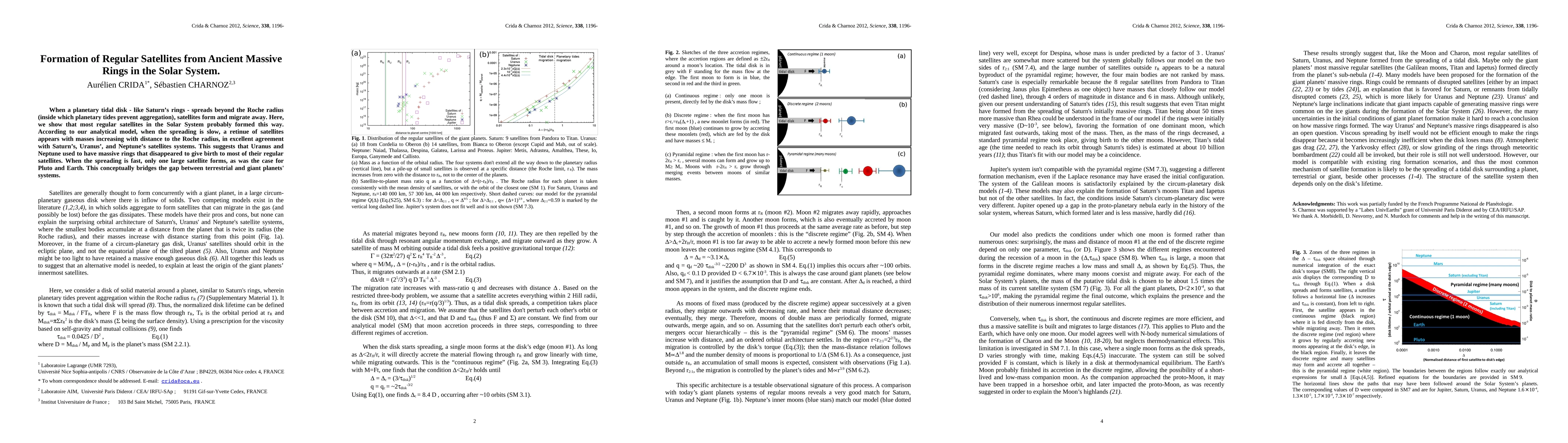When a planetary tidal disk -like Saturn's rings- spreads beyond the Roche radius (inside which planetary tides prevent aggregation), satellites form and migrate away. Here, we show that most regular satellites in the solar system probably formed in this way. According to our analytical model, when the spreading is slow, a retinue of satellites appear with masses increasing with distance to the Roche radius, in excellent agreement with Saturn's, Uranus', and Neptune's satellite systems. This suggests that Uranus and Neptune used to have massive rings that disappeared to give birth to most of their regular satellites. When the spreading is fast, only one large satellite forms, as was the case for Pluto and Earth. This conceptually bridges the gap between terrestrial and giant planet systems.