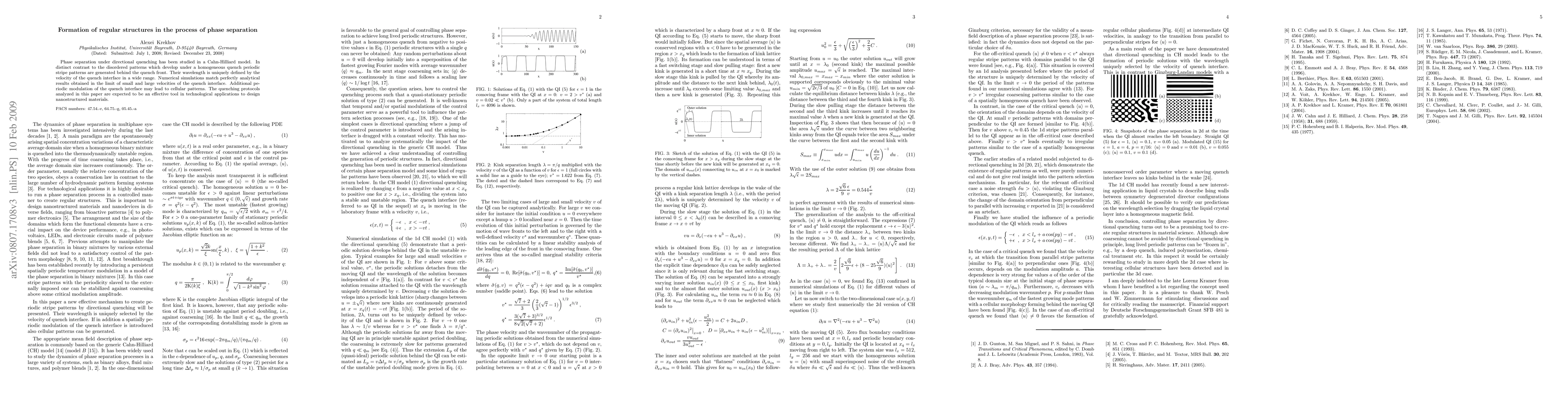 This paper investigates the formation of regular periodic stripe patterns during phase separation via directional quenching in a Cahn-Hilliard model, contrasting with disordered patterns from homogeneous quenching. The wavelength of these stripes is determined by the quench interface velocity, with numerical simulations corroborating analytical results.