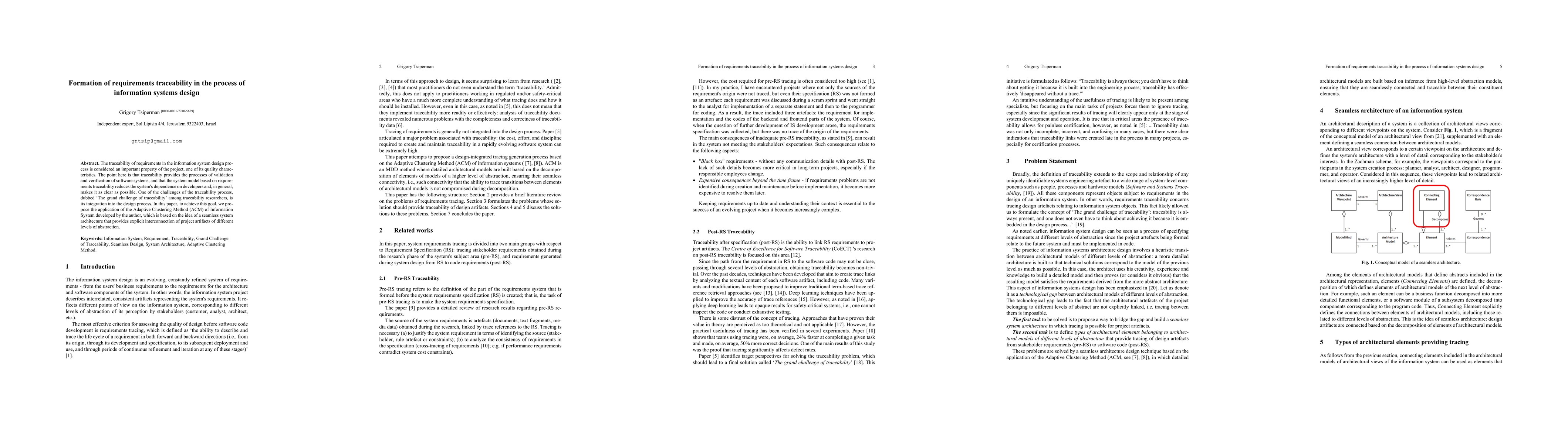 The traceability of requirements in the information system design process is considered an essential property of the project, one of its quality characteristics. The point here is that traceability provides the methods of validation and verification of software systems, and that the system model based on requirements traceability reduces the system's dependence on developers and, in general, makes it as straightforward as possible. One of the challenges of the traceability process, dubbed "The grand challenge of traceability" among traceability researchers, is its integration into the design process. In this paper, to achieve this goal, we propose the application of the Adaptive Clustering Method (ACM) of Information Systems developed by the author, which is based on the idea of a seamless system architecture that provides explicit interconnection of project artifacts of different levels of abstraction.