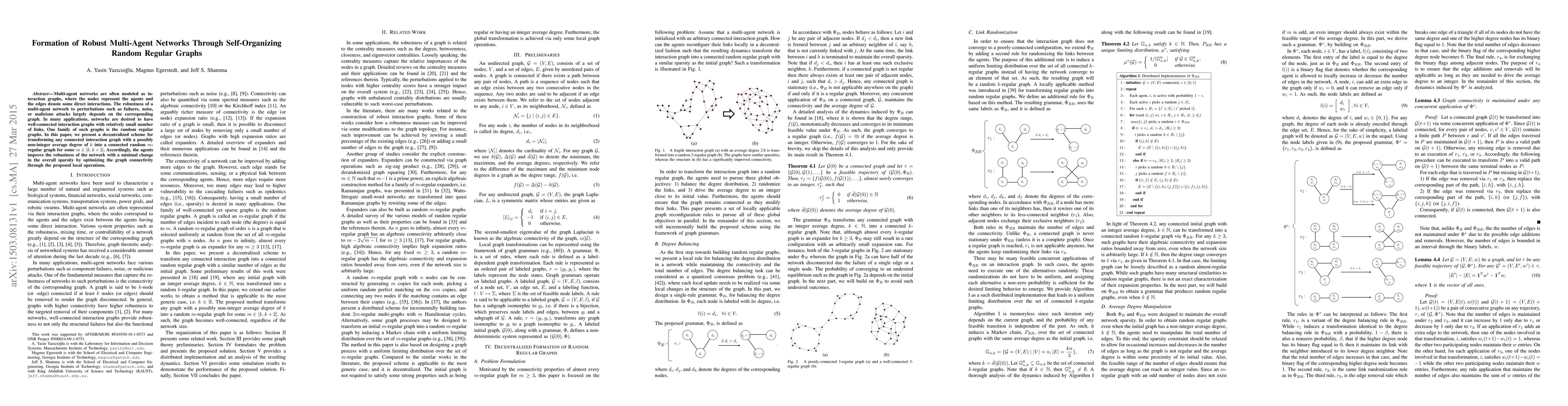 Multi-agent networks are often modeled as interaction graphs, where the nodes represent the agents and the edges denote some direct interactions. The robustness of a multi-agent network to perturbations such as failures, noise, or malicious attacks largely depends on the corresponding graph. In many applications, networks are desired to have well-connected interaction graphs with relatively small number of links. One family of such graphs is the random regular graphs. In this paper, we present a decentralized scheme for transforming any connected interaction graph with a possibly non-integer average degree of k into a connected random m-regular graph for some m in [k, k + 2]. Accordingly, the agents improve the robustness of the network with a minimal change in the overall sparsity by optimizing the graph connectivity through the proposed local operations.