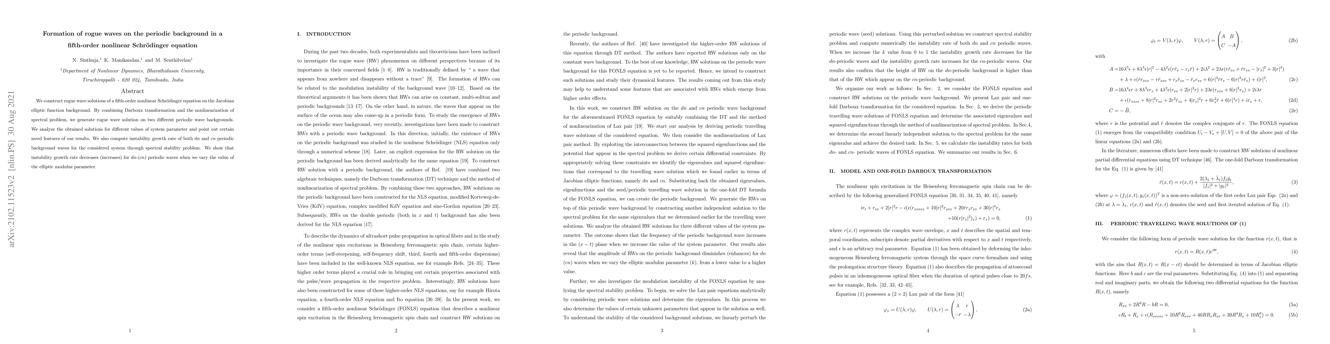 This paper constructs rogue wave solutions for a fifth-order nonlinear Schrödinger equation using Darboux transformation and spectral analysis. It reveals novel features of rogue waves on Jacobian elliptic function backgrounds and computes instability growth rates for $dn$ and $cn$ periodic waves, showing that these rates vary with the elliptic modulus parameter.