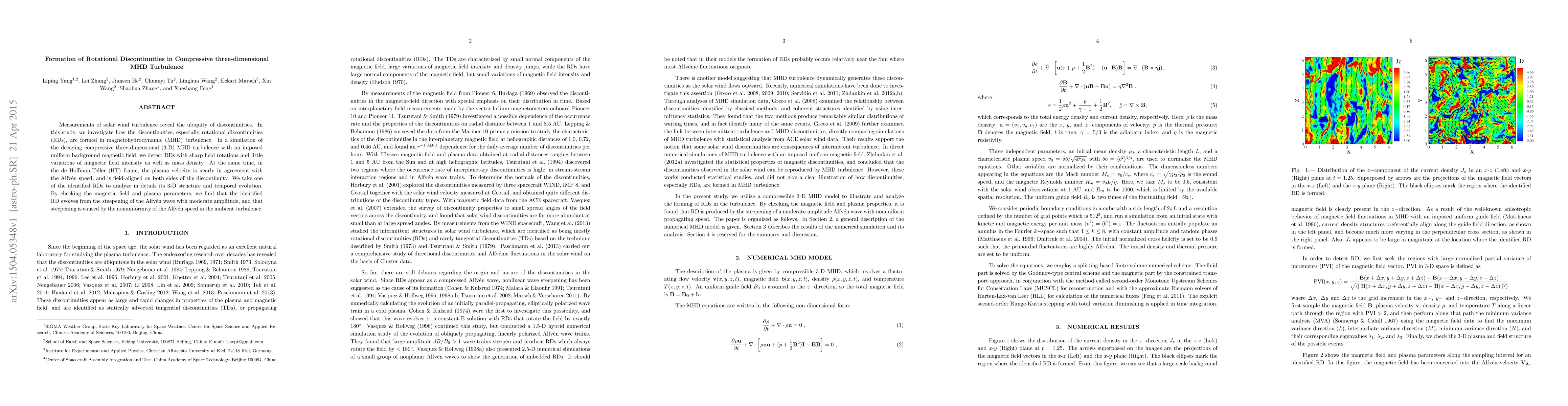 This study investigates the formation of rotational discontinuities (RDs) in compressive three-dimensional MHD turbulence, finding that RDs arise from the steepening of Alfvén waves due to nonuniform Alfvén speed in the turbulent environment. The RDs exhibit sharp magnetic field rotations and minimal changes in magnetic intensity and mass density.