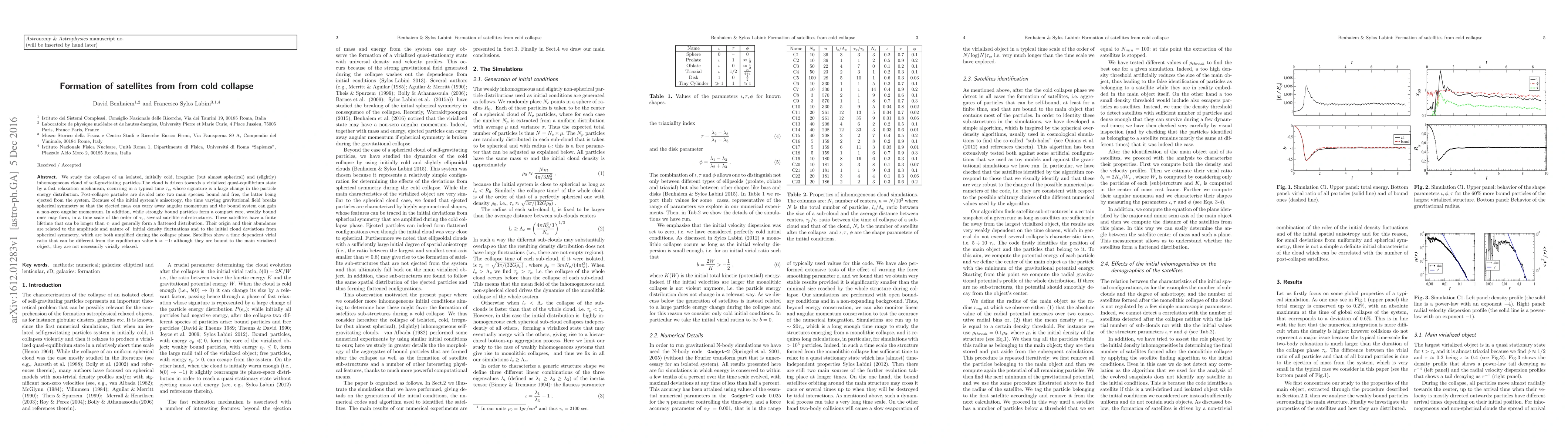 We study the collapse of an isolated, initially cold, irregular (but almost spherical) and (slightly) inhomogeneous cloud of self-gravitating particles. The cloud is driven towards a virialized quasi-equilibrium state by a fast relaxation mechanism, occurring in a typical time $\tau_c$, whose signature is a large change in the particle energy distribution. Post-collapse particles are divided into two main species: bound and free, the latter being ejected from the system. Because of the initial system's anisotropy, the time varying gravitational field breaks spherical symmetry so that the ejected mass can carry away angular momentum and the bound system can gain a non-zero angular momentum. In addition, while strongly bound particles form a compact core, weakly bound ones may form, in a time scale of the order of $\tau_c$, several satellite sub-structures. These satellites have a finite lifetime that can be longer than $\tau_c$ and generally form a flattened distribution. Their origin and their abundance are related to the amplitude and nature of initial density fluctuations and to the initial cloud deviations from spherical symmetry, which are both amplified during the collapse phase. Satellites show a time dependent virial ratio that can be different from the equilibrium value $b\approx -1$: although they are bound to the main virialized object, they are not necessarily virially relaxed.