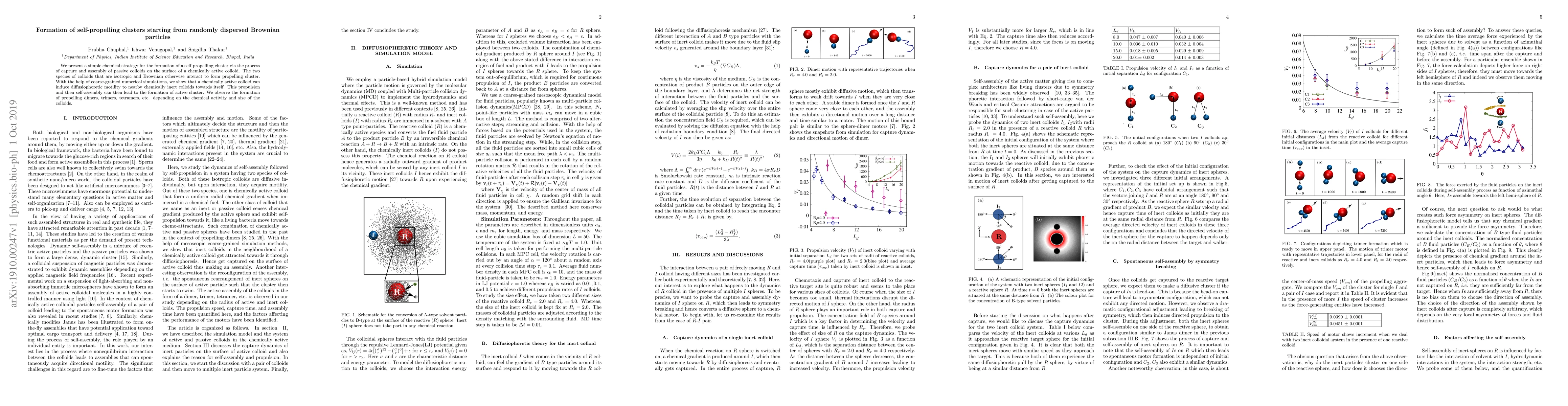 This paper details a chemical strategy for creating self-propelling clusters from randomly dispersed Brownian particles by capturing and assembling passive colloids onto chemically active colloids. Numerical simulations demonstrate that chemically active colloids induce diffusiophoretic motility in inert colloids, leading to the formation of various self-propelled clusters.