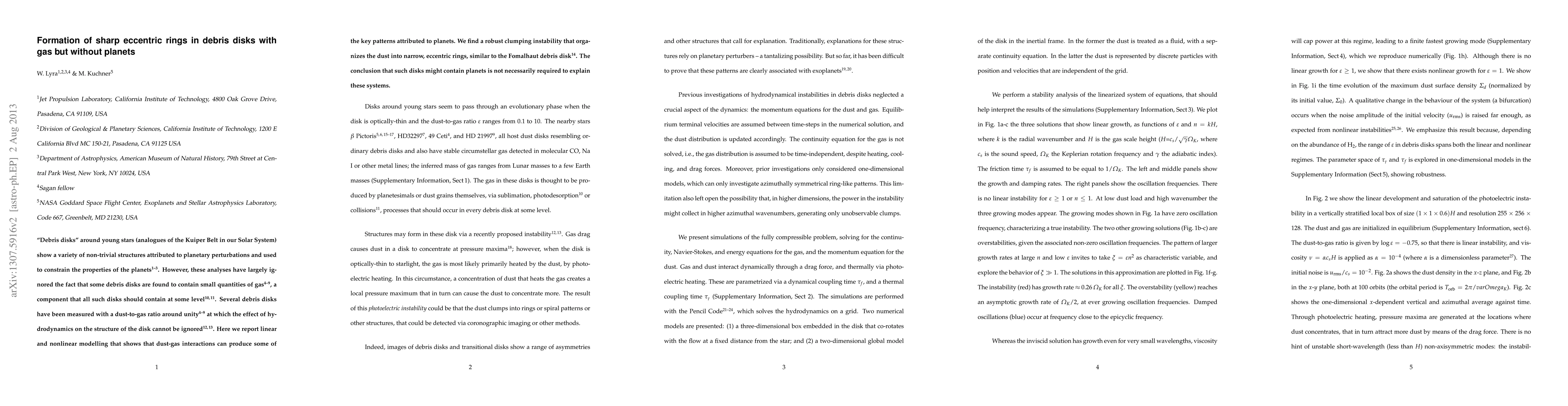 This paper demonstrates that dust-gas interactions in debris disks, which contain small quantities of gas, can produce sharp eccentric rings without the need for planetary perturbations. The study uses linear and nonlinear modeling to show that hydrodynamic effects can organize dust into narrow, eccentric rings, challenging the assumption that such structures always indicate the presence of planets.