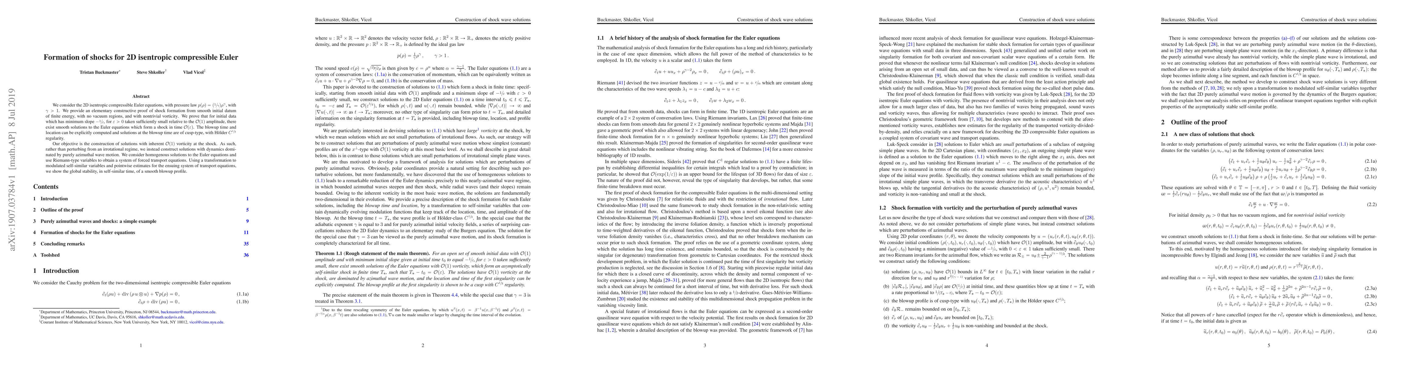 This paper provides a constructive proof for the formation of shocks in 2D isentropic compressible Euler equations, demonstrating that smooth initial data with finite energy and nontrivial vorticity can lead to shock formation in time proportional to a small parameter. The solutions exhibit cusp-type behavior and H\"older regularity, with inherent vorticity at the shock.
