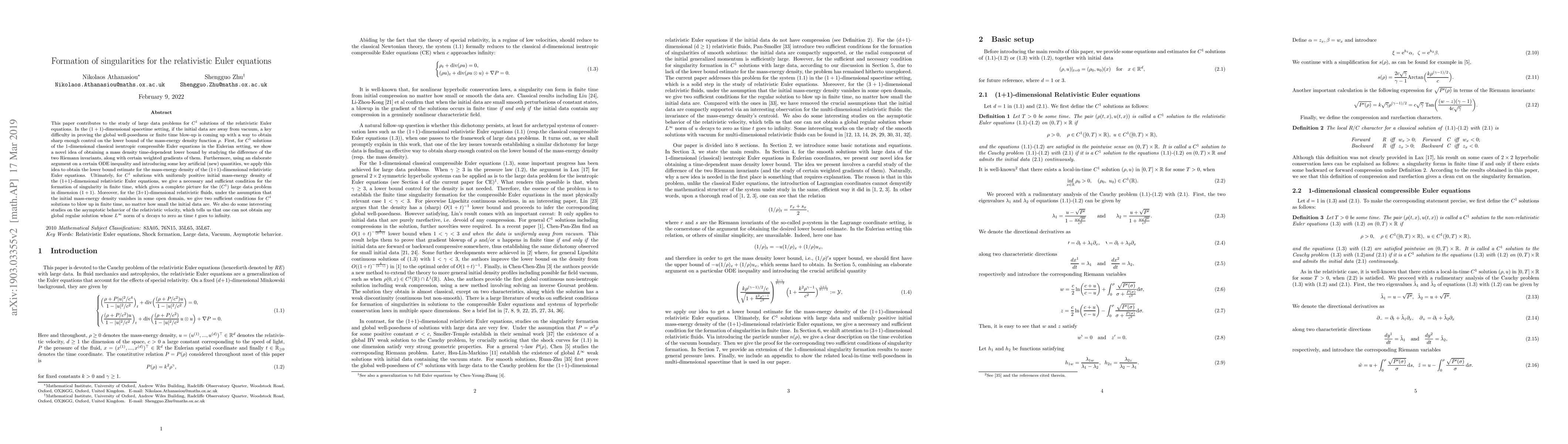 This paper studies how singularities form in relativistic fluid equations by finding conditions for finite-time blow-up based on mass-energy density bounds.