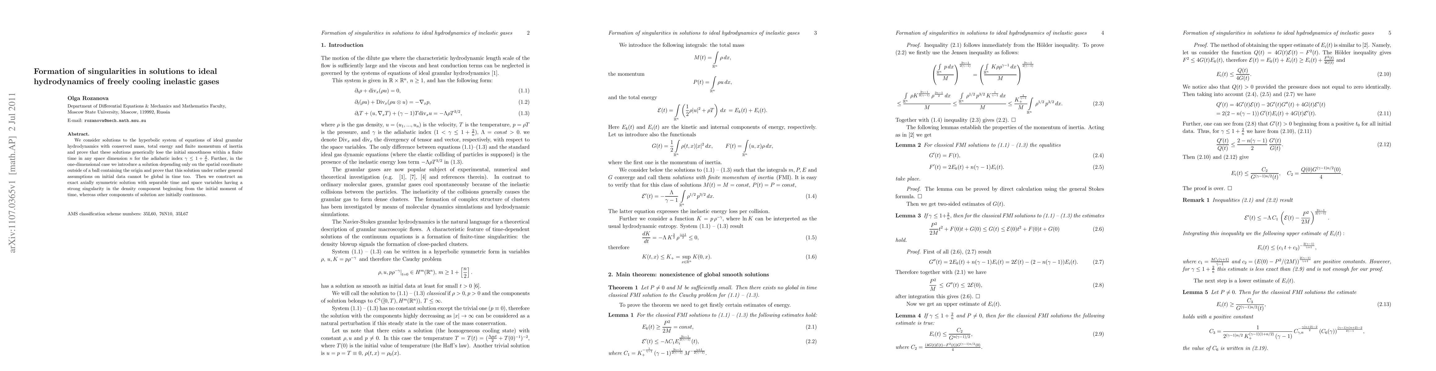 This paper proves that solutions to ideal hydrodynamics of freely cooling inelastic gases typically develop singularities within a finite time, regardless of the spatial dimension, for certain adiabatic indices. In one dimension, it further demonstrates that specific solutions cannot be globally defined in time, and constructs an exact axially symmetric solution with an initial singularity in the density component.