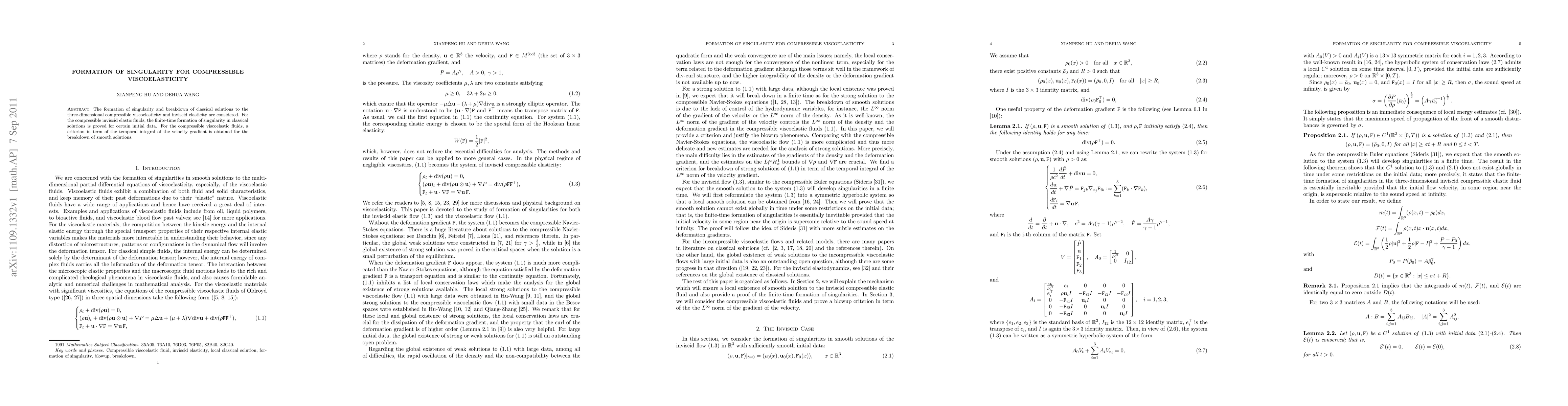 The formation of singularity and breakdown of classical solutions to the three-dimensional compressible viscoelasticity and inviscid elasticity are considered. For the compressible inviscid elastic fluids, the finite-time formation of singularity in classical solutions is proved for certain initial data. For the compressible viscoelastic fluids, a criterion in term of the temporal integral of the velocity gradient is obtained for the breakdown of smooth solutions.