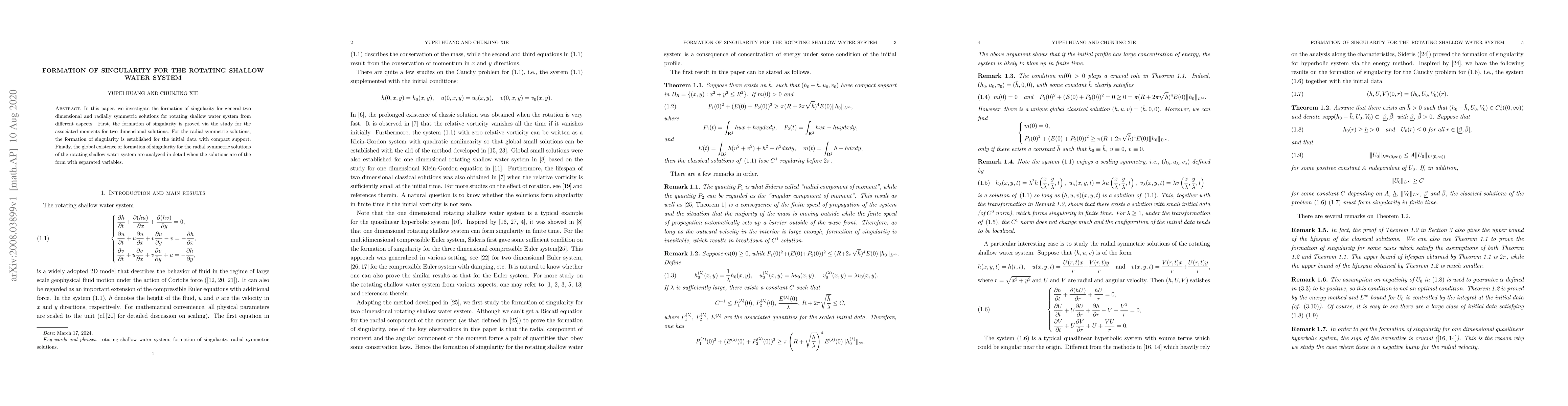 This paper proves the formation of singularities in rotating shallow water systems for both two-dimensional and radially symmetric solutions, employing methods that analyze associated moments and initial data with compact support. It also examines the global existence or singularity formation for radial symmetric solutions with separated variable forms.