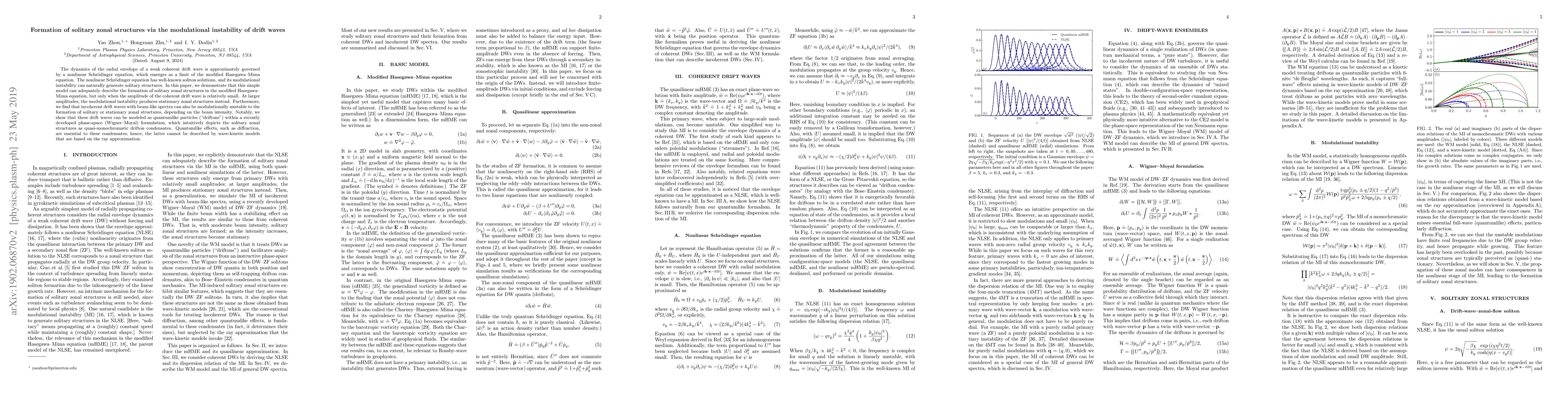The dynamics of the radial envelope of a weak coherent drift wave is approximately governed by a nonlinear Schr\"odinger equation, which emerges as a limit of the modified Hasegawa-Mima equation. The nonlinear Schr\"odinger equation has well-known soliton solutions, and its modulational instability can naturally generate solitary structures. In this paper, we demonstrate that this simple model can adequately describe the formation of solitary zonal structures in the modified Hasegawa-Mima equation, but only when the amplitude of the coherent drift wave is relatively small. At larger amplitudes, the modulational instability produces stationary zonal structures instead. Furthermore, we find that incoherent drift waves with beam-like spectra can also be modulationally unstable to the formation of solitary or stationary zonal structures, depending on the beam intensity. Notably, we show that these drift waves can be modeled as quantumlike particles ("driftons") within a recently developed phase-space (Wigner-Moyal) formulation, which intuitively depicts the solitary zonal structures as quasi-monochromatic drifton condensates. Quantumlike effects, such as diffraction, are essential to these condensates; hence, the latter cannot be described by wave-kinetic models that are based on the ray approximation.