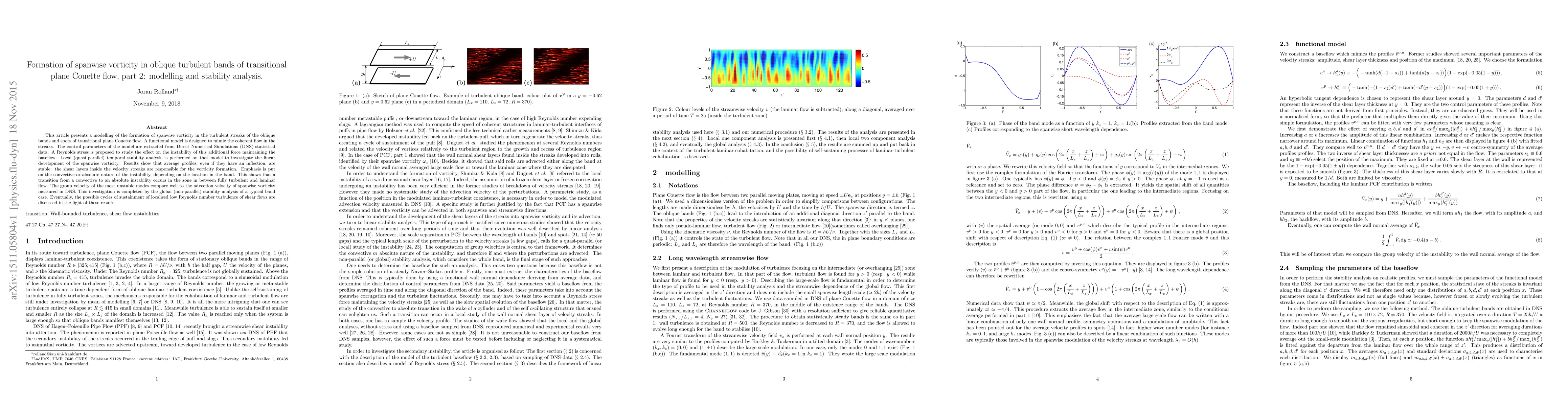 This paper models the formation of spanwise vorticity in turbulent streaks of transitional plane Couette flow, using a functional model derived from DNS data. Stability analysis reveals that shear layers within streaks generate vorticity, with a transition from convective to absolute instability occurring between turbulent and laminar zones.