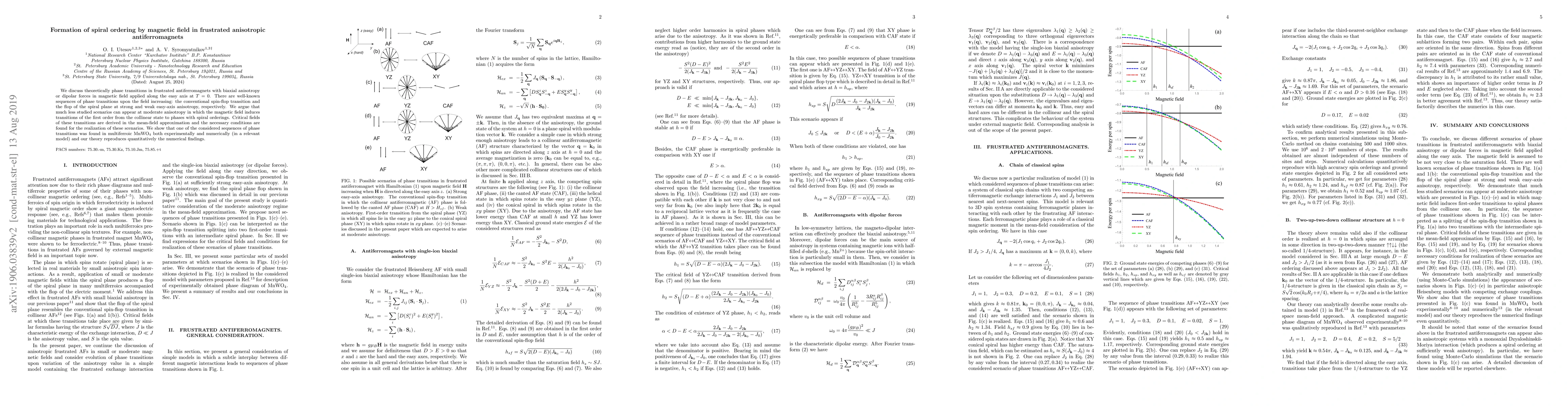 We discuss theoretically phase transitions in frustrated antiferromagnets with biaxial anisotropy or dipolar forces in magnetic field applied along the easy axis at $T=0$. There are well-known sequences of phase transitions upon the field increasing: the conventional spin-flop transition and the flop of the spiral plane at strong and weak easy-axis anisotropy, respectively. We argue that much less studied scenarios can appear at moderate anisotropy in which the magnetic field induces transitions of the first order from the collinear state to phases with spiral orderings. Critical fields of these transitions are derived in the mean-field approximation and the necessary conditions are found for the realization of these scenarios. We show that one of the considered sequences of phase transitions was found in multiferroic MnWO$_4$ both experimentally and numerically (in a relevant model) and our theory reproduces quantitatively the numerical findings.