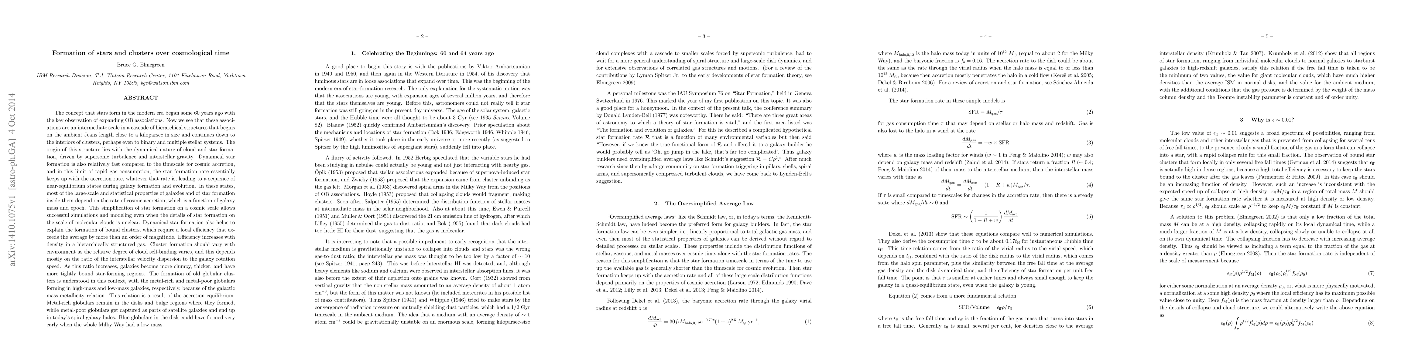The concept that stars form in the modern era began some 60 years ago with the key observation of expanding OB associations. Now we see that these associations are an intermediate scale in a cascade of hierarchical structures that begins on the ambient Jeans length close to a kiloparsec in size and continues down to the interiors of clusters, perhaps even to binary and multiple stellar systems. The origin of this structure lies with the dynamical nature of cloud and star formation, driven by supersonic turbulence and interstellar gravity. Dynamical star formation is relatively fast compared to the timescale for cosmic accretion, and then the star formation rate keeps up with the accretion rate, leading to a sequence of near-equilibrium states during galaxy formation and evolution. Dynamical star formation also helps to explain the formation of bound clusters, which require a local efficiency that exceeds the average by more than an order of magnitude. Efficiency increases with density in a hierarchically structured gas. Cluster formation should vary with environment as the relative degree of cloud self-binding varies, and this depends on the ratio of the interstellar velocity dispersion to the galaxy rotation speed. As this ratio increases, galaxies become more clumpy, thicker, and have more tightly bound star-forming regions. The formation of old globular clusters is understood in this context, with the metal-rich and metal-poor globulars forming in high-mass and low-mass galaxies, respectively, because of the galactic mass-metallicity relation. Metal-rich globulars remain in the disks and bulge regions where they formed, while metal-poor globulars get captured as parts of satellite galaxies and end up in today's spiral galaxy halos. Blue globulars in the disk could have formed very early when the whole Milky Way had a low mass.