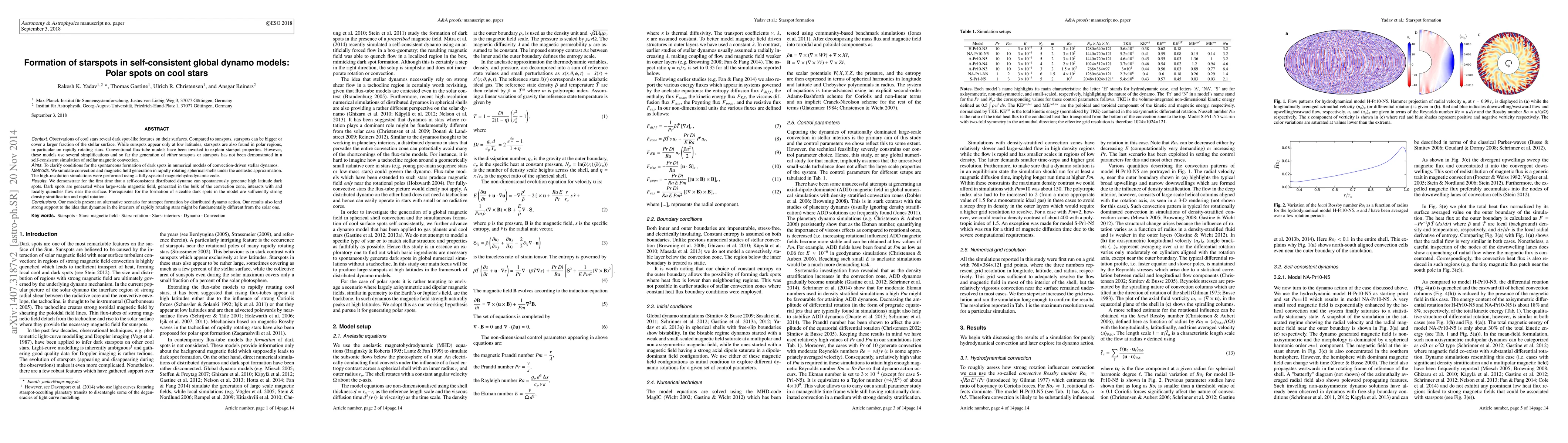 This paper demonstrates that self-consistent global dynamo models can spontaneously generate starspots, including polar spots on cool stars, through distributed dynamo action. The simulations show that strong magnetic flux concentrations form due to interactions between large-scale magnetic fields and surface convection, facilitated by density stratification and rapid rotation.
