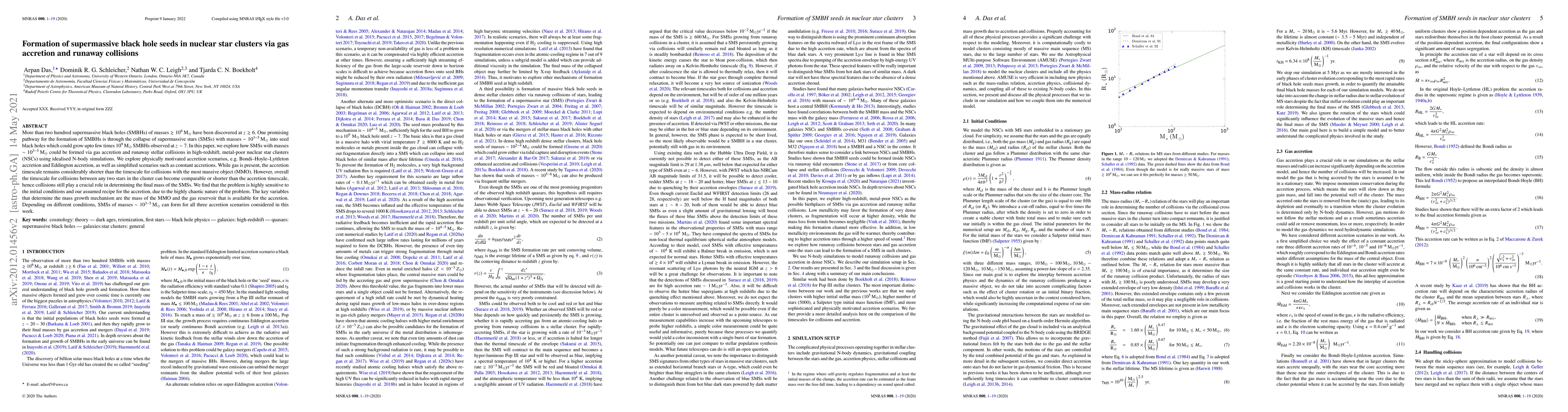 This paper explores the formation of supermassive black hole seeds through gas accretion and runaway stellar collisions in high-redshift nuclear star clusters. It finds that while gas accretion is faster, collisions can still play a crucial role in the growth of supermassive stars, which can eventually form seeds for supermassive black holes.