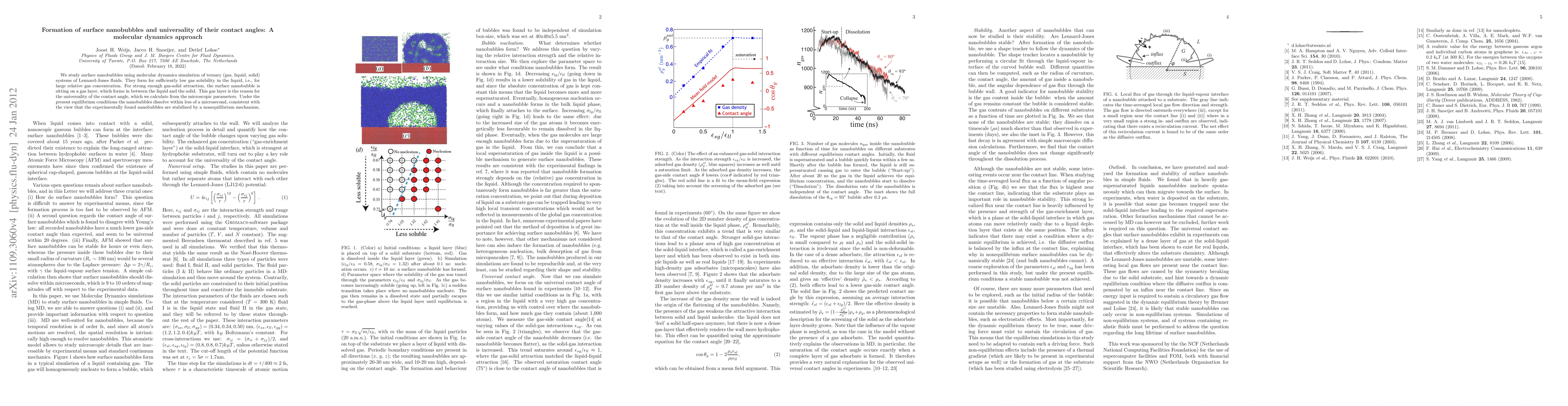 Researchers used molecular dynamics simulation to study surface nanobubbles in ternary systems, finding that they form when gas is soluble enough in liquid and solid-gas attraction is strong, leading to a universal contact angle due to a gas layer between the liquid and solid.