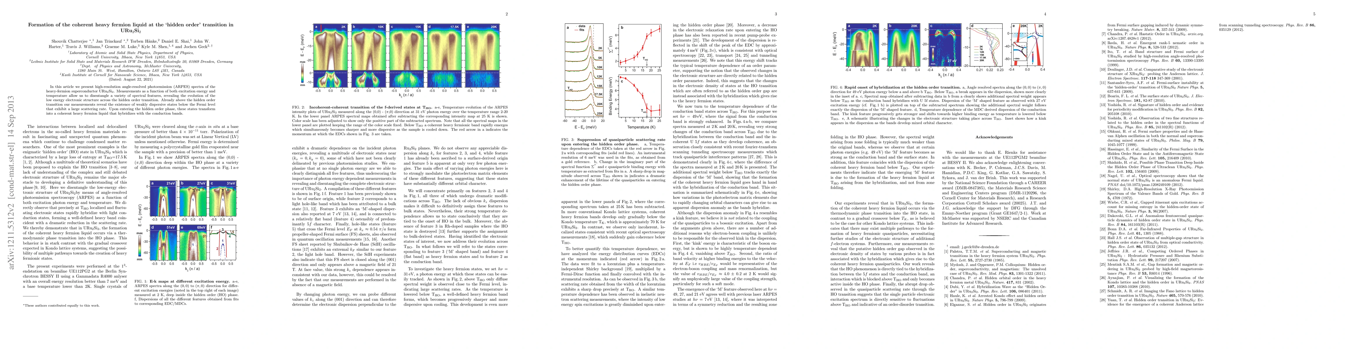 In this article we present high-resolution angle-resolved photoemission (ARPES) spectra of the heavy-fermion superconductor URu$_2$Si$_2$. Measurements as a function of both excitation energy and temperature allow us to disentangle a variety of spectral features, revealing the evolution of the low energy electronic structure across the hidden order transition. Already above the hidden order transition our measurements reveal the existence of weakly dispersive states below the Fermi level that exhibit a large scattering rate. Upon entering the hidden order phase, these states transform into a coherent heavy fermion liquid that hybridizes with the conduction bands.