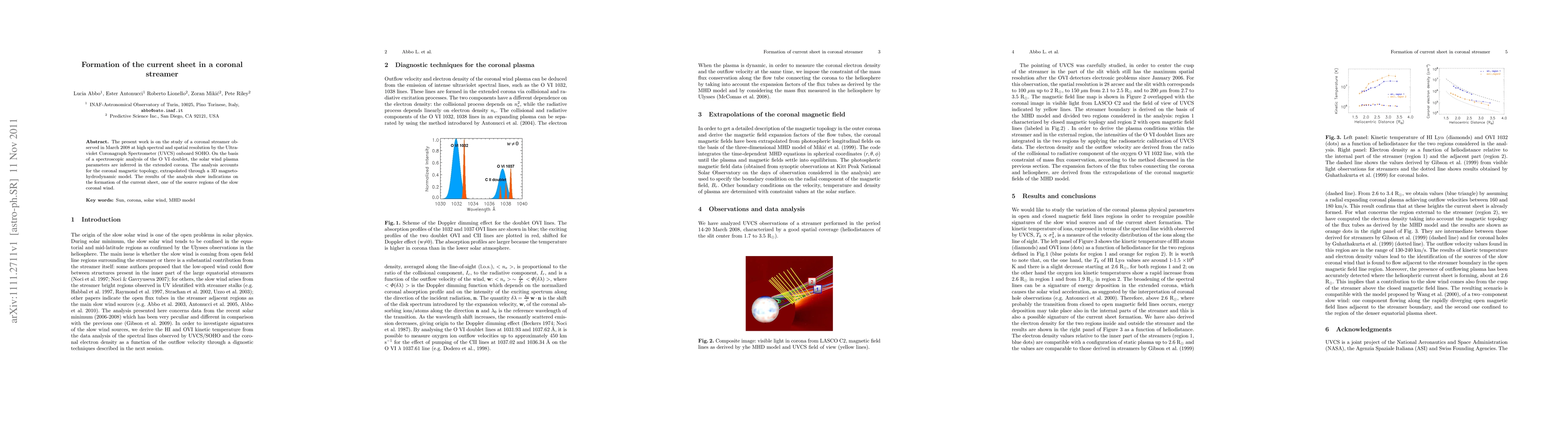 This study investigates a coronal streamer observed in 2008 using the UVCS on SOHO, analyzing O VI doublet data to infer solar wind parameters and magnetic topology. The findings suggest the formation of a current sheet, a key region for the slow coronal wind.