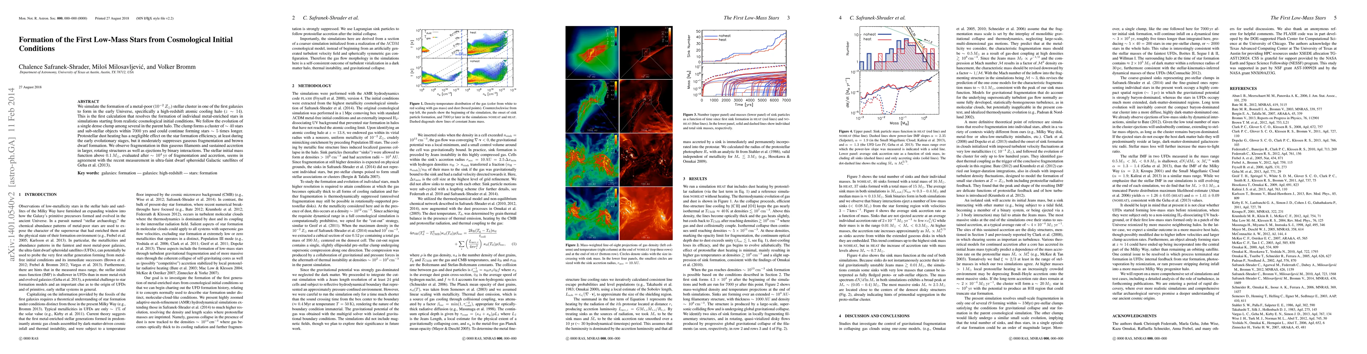We simulate the formation of a metal-poor (10^-2 Zsun) stellar cluster in one of the first galaxies to form in the early Universe, specifically a high-redshift atomic cooling halo (z~14). This is the first calculation that resolves the formation of individual metal-enriched stars in simulations starting from realistic cosmological initial conditions. We follow the evolution of a single dense clump among several in the parent halo. The clump forms a cluster of ~40 stars and sub-stellar objects within 7000 years and could continue forming stars ~5 times longer. Protostellar dust heating has a negligible effect on the star formation efficiency, at least during the early evolutionary stages, but it moderately suppresses gaseous fragmentation and brown dwarf formation. We observe fragmentation in thin gaseous filaments and sustained accretion in larger, rotating structures as well as ejections by binary interactions. The stellar initial mass function above 0.1 Msun, evaluated after ~10^4 years of fragmentation and accretion, seems in agreement with the recent measurement in ultra-faint dwarf spheroidal Galactic satellites of Geha et al. (2013).