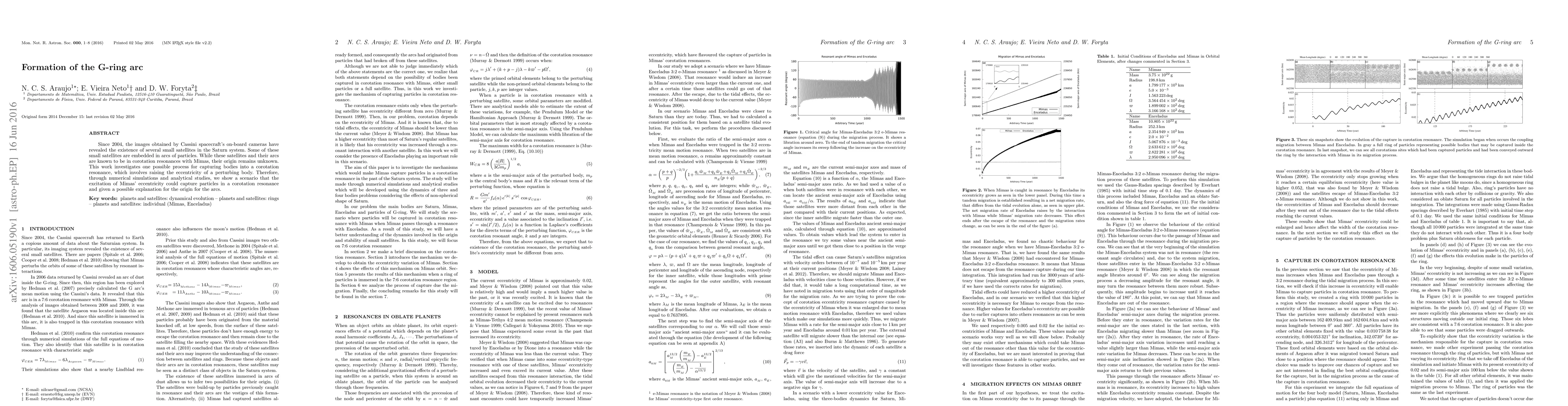 Since 2004, the images obtained by Cassini spacecraft's on-board cameras have revealed the existence of several small satellites in the Saturn system. Some of these small satellites are embedded in arcs of particles. While these satellites and their arcs are known to be in corotation resonances with Mimas, their origin remains unknown. This work investigates one possible process for capturing bodies into a corotation resonance, which involves raising the eccentricity of a perturbing body. Therefore, through numerical simulations and analytical studies, we show a scenario that the excitation of Mimas' eccentricity could capture particles in a corotation resonance and given a possible explanation for the origin for the arcs.