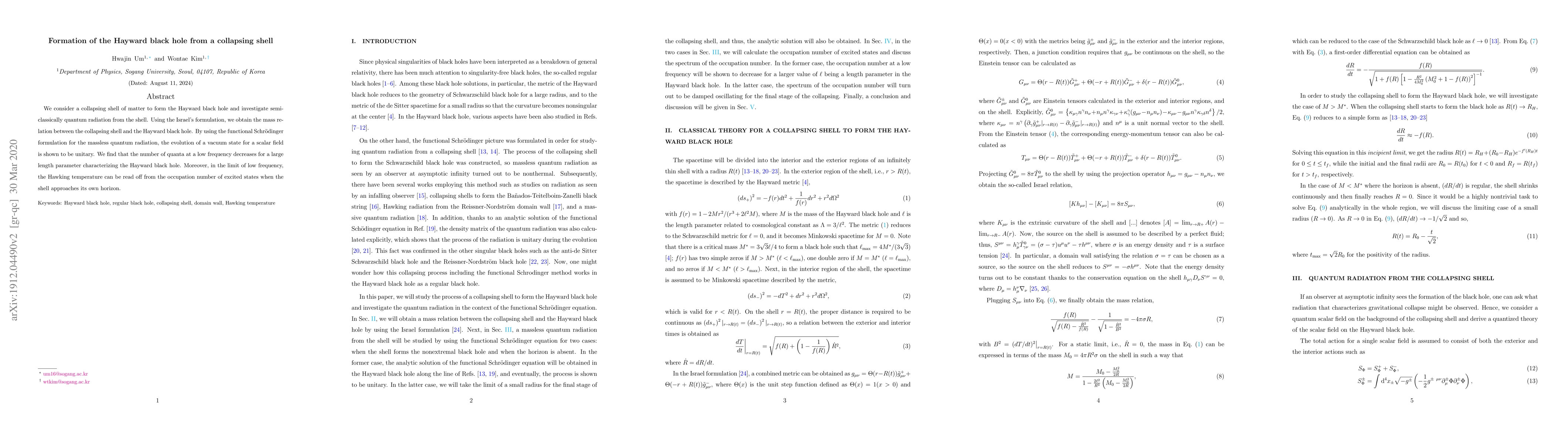 This paper explores the formation of a Hayward black hole from a collapsing shell of matter, using Israel's formulation to derive the mass relation. It demonstrates unitary evolution of a vacuum state for scalar field quantum radiation, showing a decrease in low-frequency quanta for larger Hayward black hole parameters, and derives the Hawking temperature from excited state occupation numbers as the shell nears its horizon.