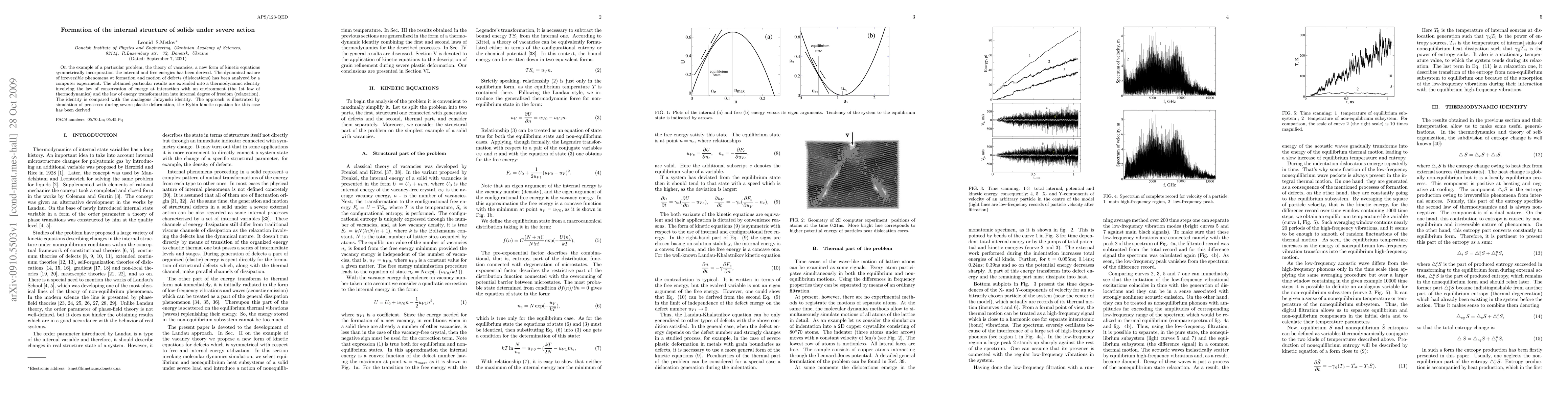 On the example of a particular problem, the theory of vacancies, a new form of kinetic equations symmetrically incorporation the internal and free energies has been derived. The dynamical nature of irreversible phenomena at formation and motion of defects (dislocations) has been analyzed by a computer experiment. The obtained particular results are extended into a thermodynamic identity involving the law of conservation of energy at interaction with an environment (the 1st law of thermodynamics) and the law of energy transformation into internal degree of freedom (relaxation). The identity is compared with the analogous Jarzynski identity. The approach is illustrated by simulation of processes during severe plastic deformation, the Rybin kinetic equation for this case has been derived.