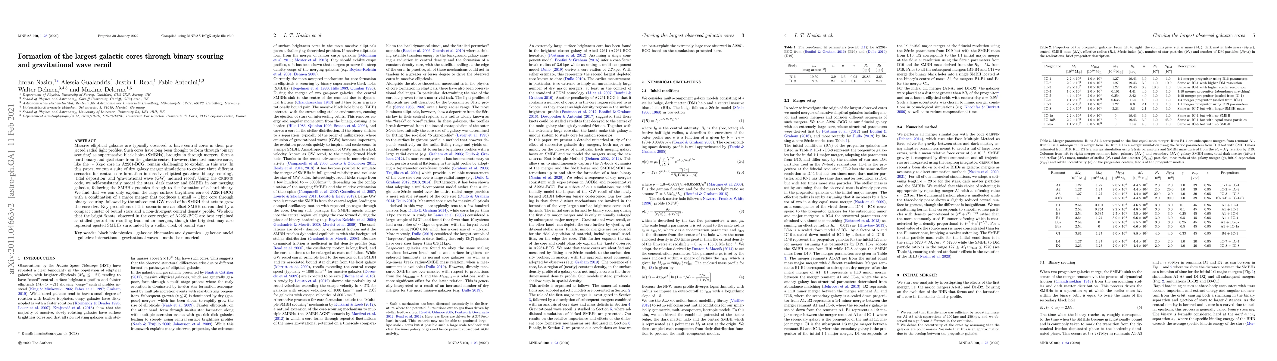 This paper explores the formation of massive galactic cores through simulations of dry galaxy mergers, finding that the largest cores, like the ~3kpc core in A2261-BCG, require a combination of binary scouring and gravitational wave recoil of supermassive black holes. The study predicts an offset SMBH and bright knots in the core region as key observational signatures.