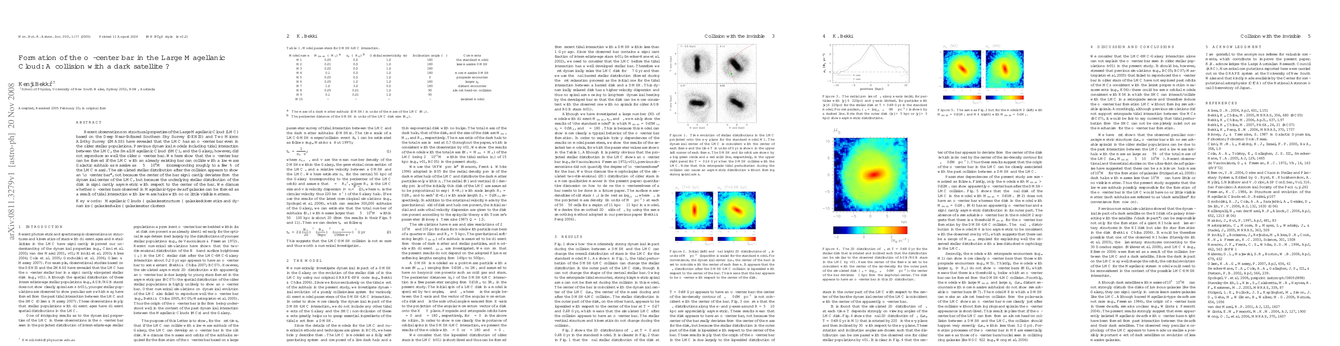 This paper investigates the formation of an off-center bar in the Large Magellanic Cloud (LMC) and suggests that a collision with a low-mass dark satellite subhalo could be responsible. Simulations show that such a collision can create an asymmetric stellar distribution, mimicking an off-center bar.