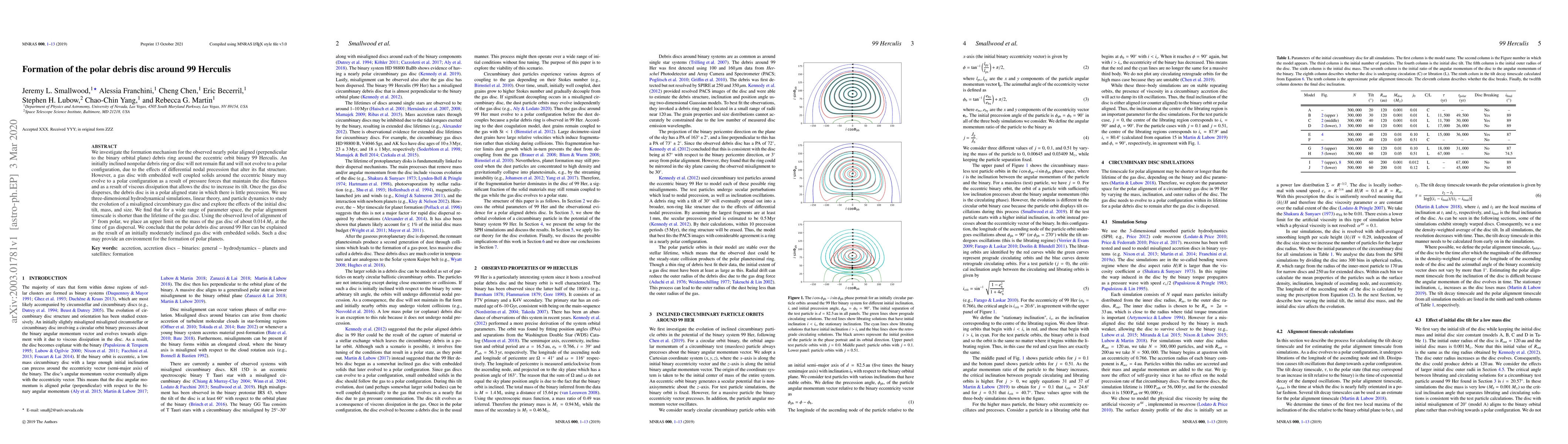 The study investigates the formation of a nearly polar debris disc around the binary system 99 Herculis, finding that a misaligned gas disc with embedded solids can evolve into a polar configuration due to pressure forces and viscous dissipation. The research concludes that the observed alignment suggests a gas disc mass of no more than 0.014 M_sun at the time of dispersal.