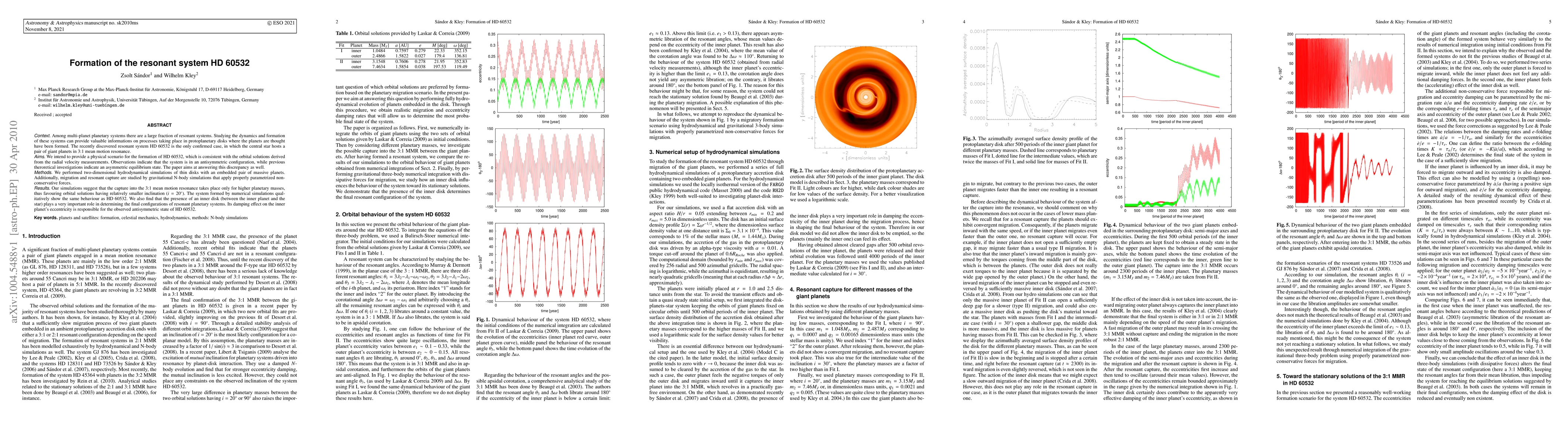 Among multi-planet planetary systems there are a large fraction of resonant systems. Studying the dynamics and formation of these systems can provide valuable informations on processes taking place in protoplanetary disks where the planets are thought have been formed. The recently discovered resonant system HD 60532 is the only confirmed case, in which the central star hosts a pair of giant planets in 3:1 mean motion resonance. We intend to provide a physical scenario for the formation of HD 60532, which is consistent with the orbital solutions derived from the radial velocity measurements. Observations indicate that the system is in an antisymmetric configuration, while previous theoretical investigations indicate an asymmetric equilibrium state. The paper aims at answering this discrepancy as well. We performed two-dimensional hydrodynamical simulations of thin disks with an embedded pair of massive planets. Additionally, migration and resonant capture are studied by gravitational N-body simulations that apply properly parametrized non-conservative forces. Our simulations suggest that the capture into the 3:1 mean motion resonance takes place only for higher planetary masses, thus favouring orbital solutions having relatively smaller inclination i=20 degrees. The system formed by numerical simulations qualitatively show the same behaviour as HD 60532. We also find that the presence of an inner disk (between the inner planet and the star) plays a very important role in determining the final configurations of resonant planetary systems. Its damping effect on the inner planet's eccentricity is responsible for the observed antisymmetric state of HD 60532.