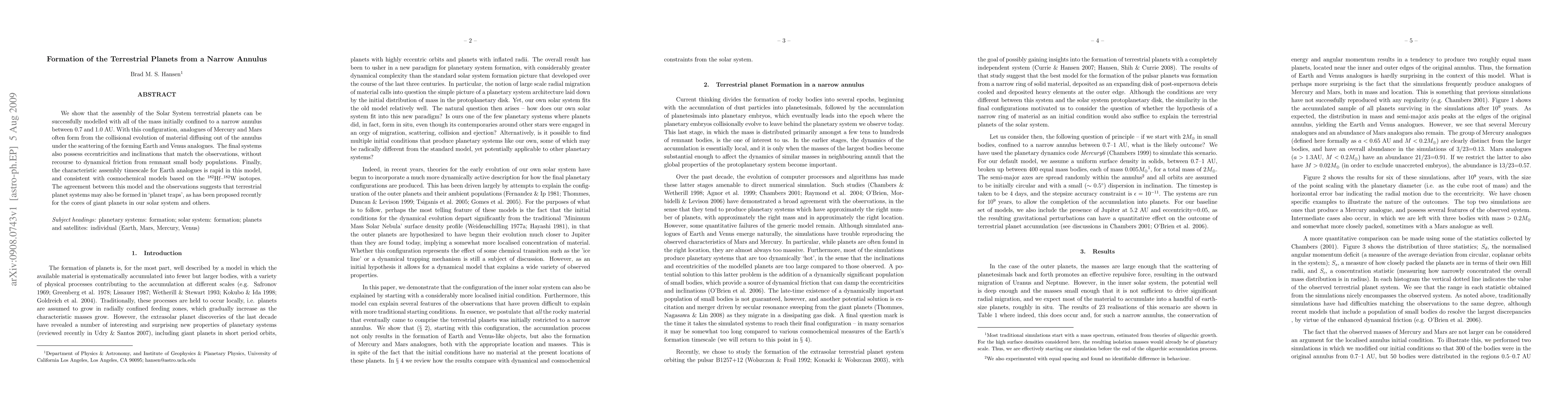 We show that the assembly of the Solar System terrestrial planets can be successfully modelled with all of the mass initially confined to a narrow annulus between 0.7 and 1.0 AU. With this configuration, analogues of Mercury and Mars often form from the collisional evolution of material diffusing out of the annulus under the scattering of the forming Earth and Venus analogues. The final systems also possess eccentricities and inclinations that match the observations, without recourse to dynamical friction from remnant small body populations. Finally, the characteristic assembly timescale for Earth analogues is rapid in this model, and consistent with cosmochemical models based on the $^{182}$Hf--$^{182}$W isotopes. The agreement between this model and the observations suggests that terrestrial planet systems may also be formed in `planet traps', as has been proposed recently for the cores of giant planets in our solar system and others.